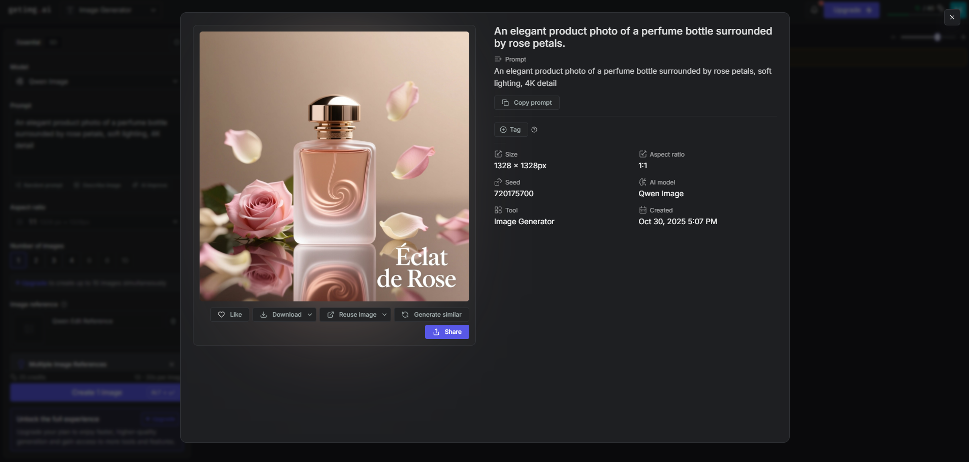 “An elegant product photo of a perfume bottle surrounded by rose petals, soft lighting, 4K detail.”