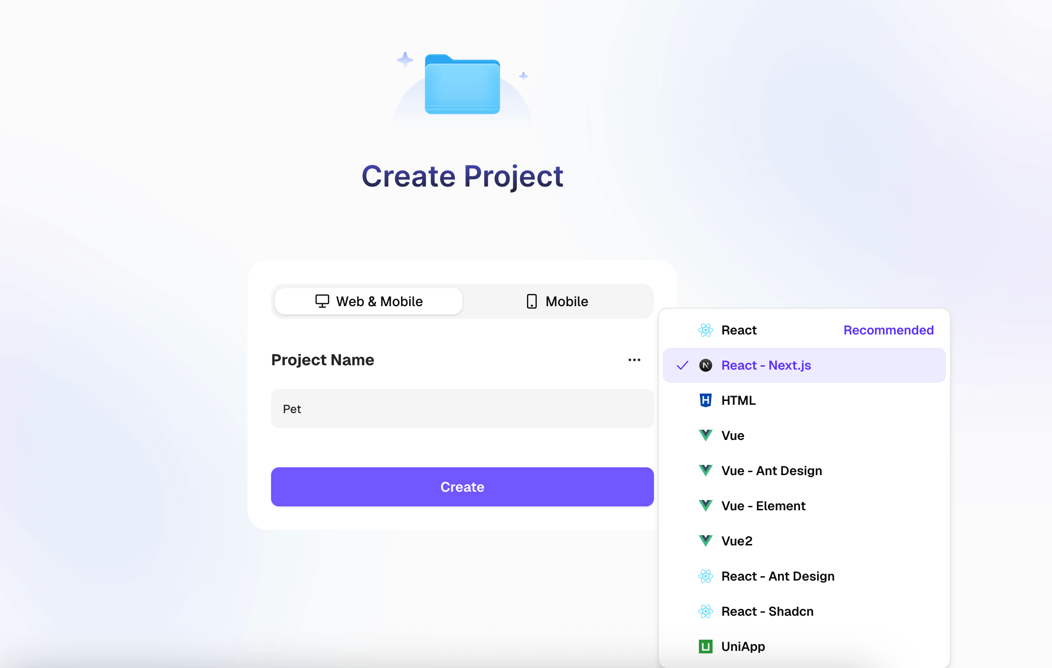 When creating a new project, you’ll need to choose the programming language for your AI development. In addition to HTML, popular frameworks such as Vue, React, and UniApp are also supported.