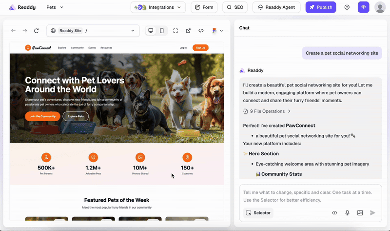 For example, the front-end design shown below was generated using Readdy for a social app made for pet lovers. The result? Absolutely stunning — clean, modern, and totally production-ready.