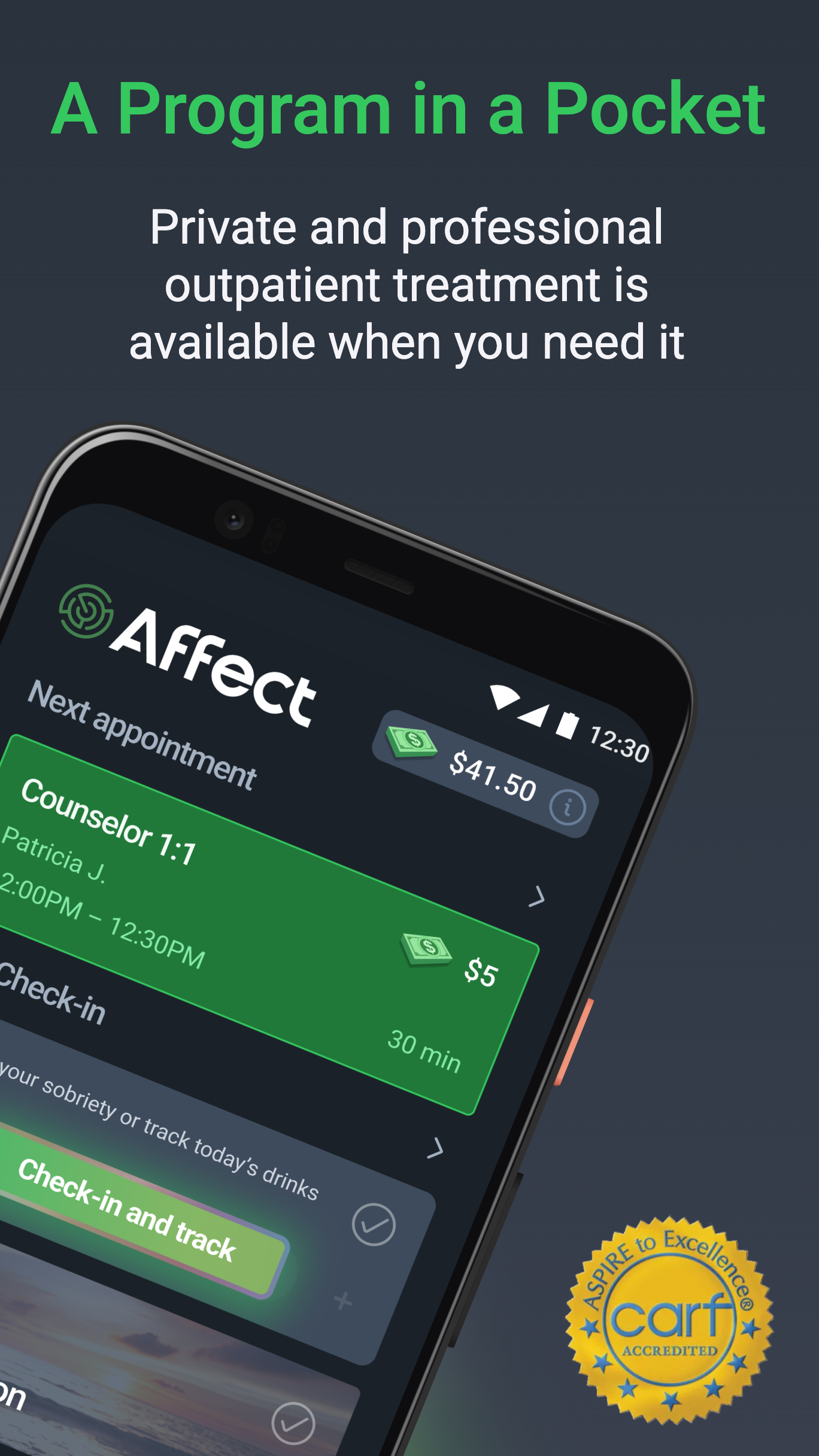 Affect is more than a sobriety app or sober tracker. It is the first integrated addiction recovery app to provide a full outpatient treatment program with rewards as you make progress. You don't have to go to rehab to stop drinking and using drugs. Affect puts a recovery program right in your pocket.
