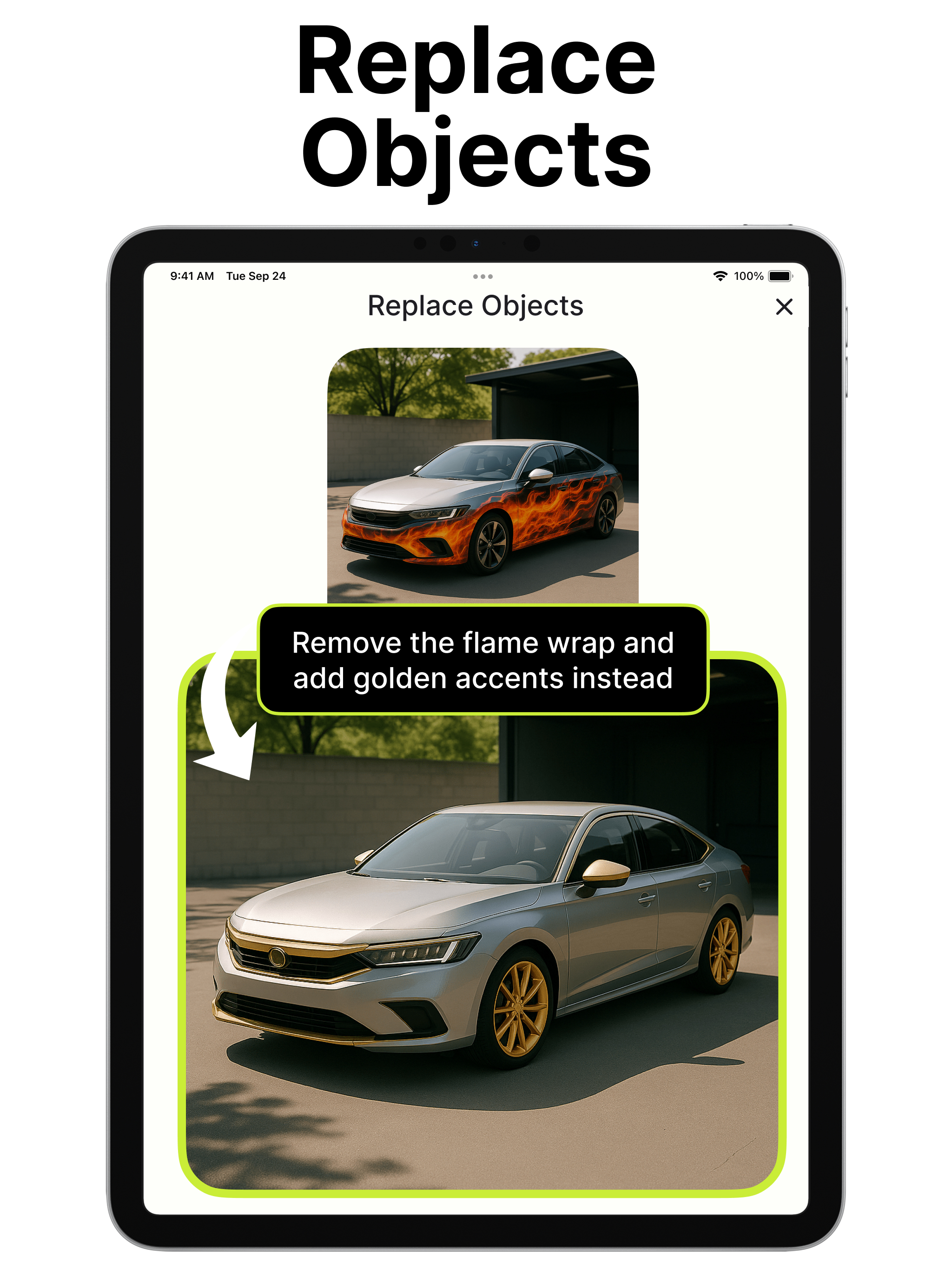 Clean up your car photos in one tap. Erase scratches, plates, background clutter, reflections, or unwanted parts. Perfect for showcasing clean builds and realistic visuals.