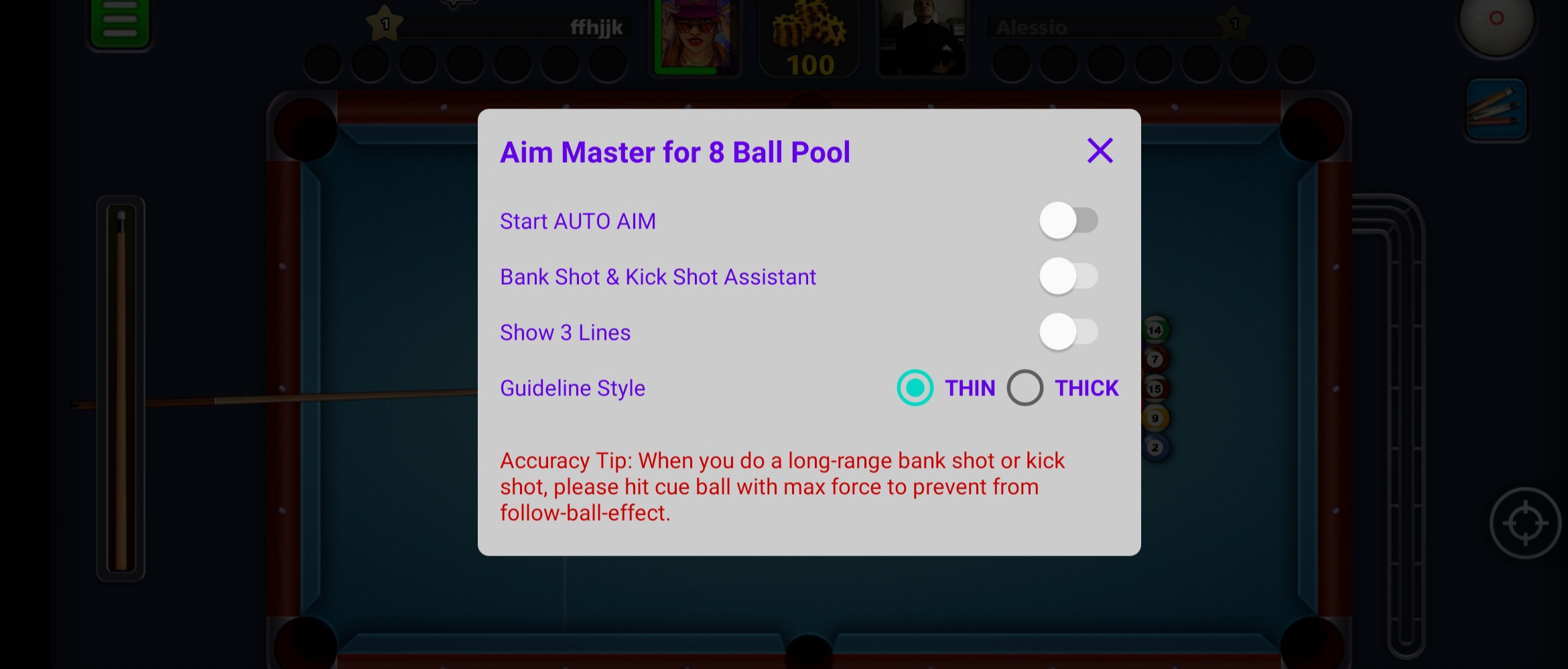 Aim Master for 8 Ball Pool is a professional tool designed for players of 8 ball pool, aiming to help you become a master of billiards and pool games. With its advanced features, this tool enhances your aiming skills and provides an extended aim line, allowing you to make precise and accurate shots. Whether it's a straight shot, bank shot, or cushion shot, Aim Master for 8 Ball Pool has got you covered, making you feel like you're using a real ruler or a precise formula to calculate angles.