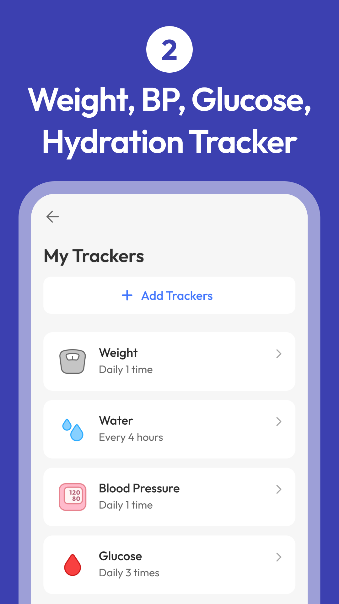 Medication reminder, Trackers for BP, glucose, weight, water, med list and so on