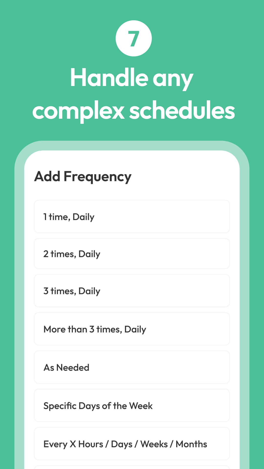 - Complex schedules made easy: PRN (as-needed), multi-dose per day, specific days, tapering, custom frequencies