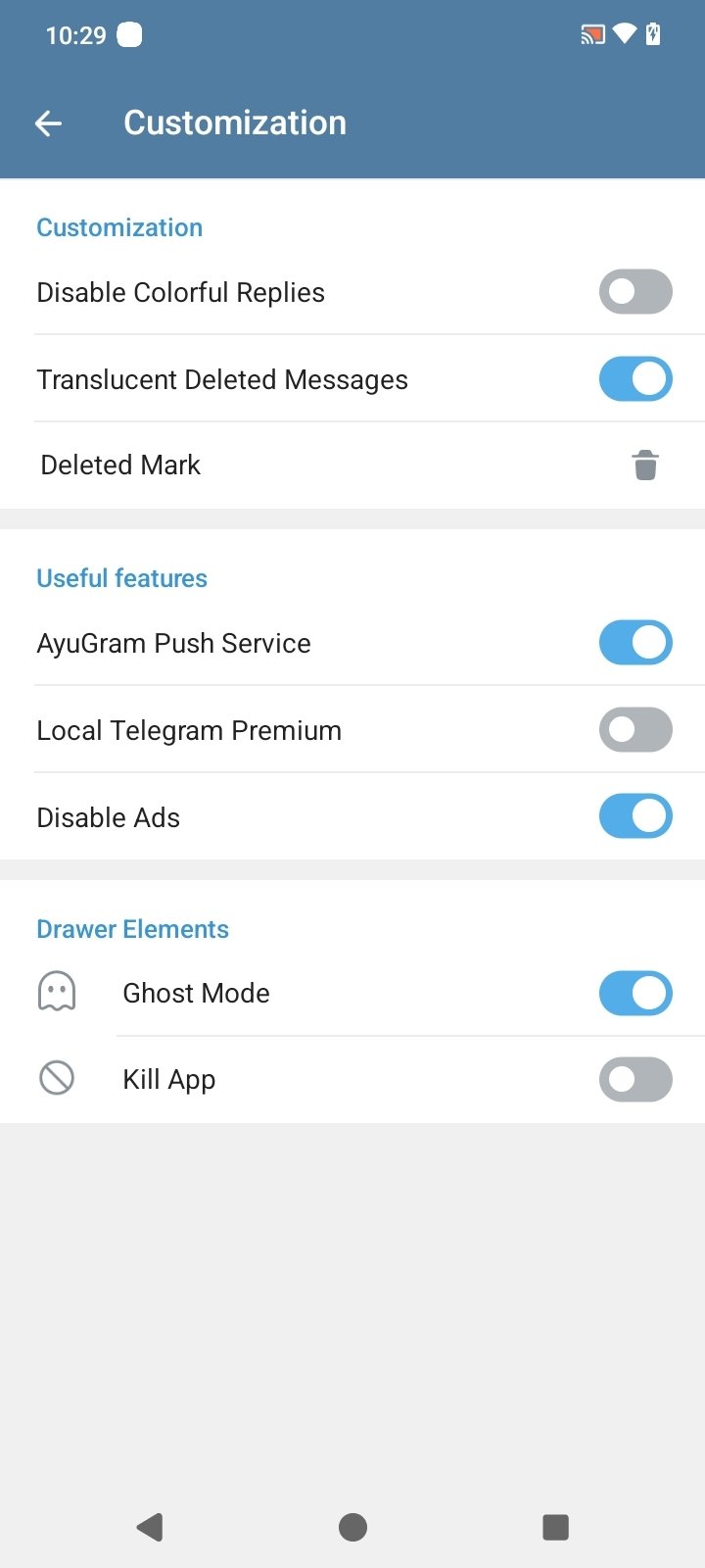 AyuGram includes extensive customization settings, accessible via two additional configuration sections in the settings menu—one for exteraGram base features and another exclusive to AyuGram. Users can personalize interface themes, font styles, edited/deleted message marks, and even activate client-side Telegram Premium features such as emoji statuses and profile color icons without official subscription.