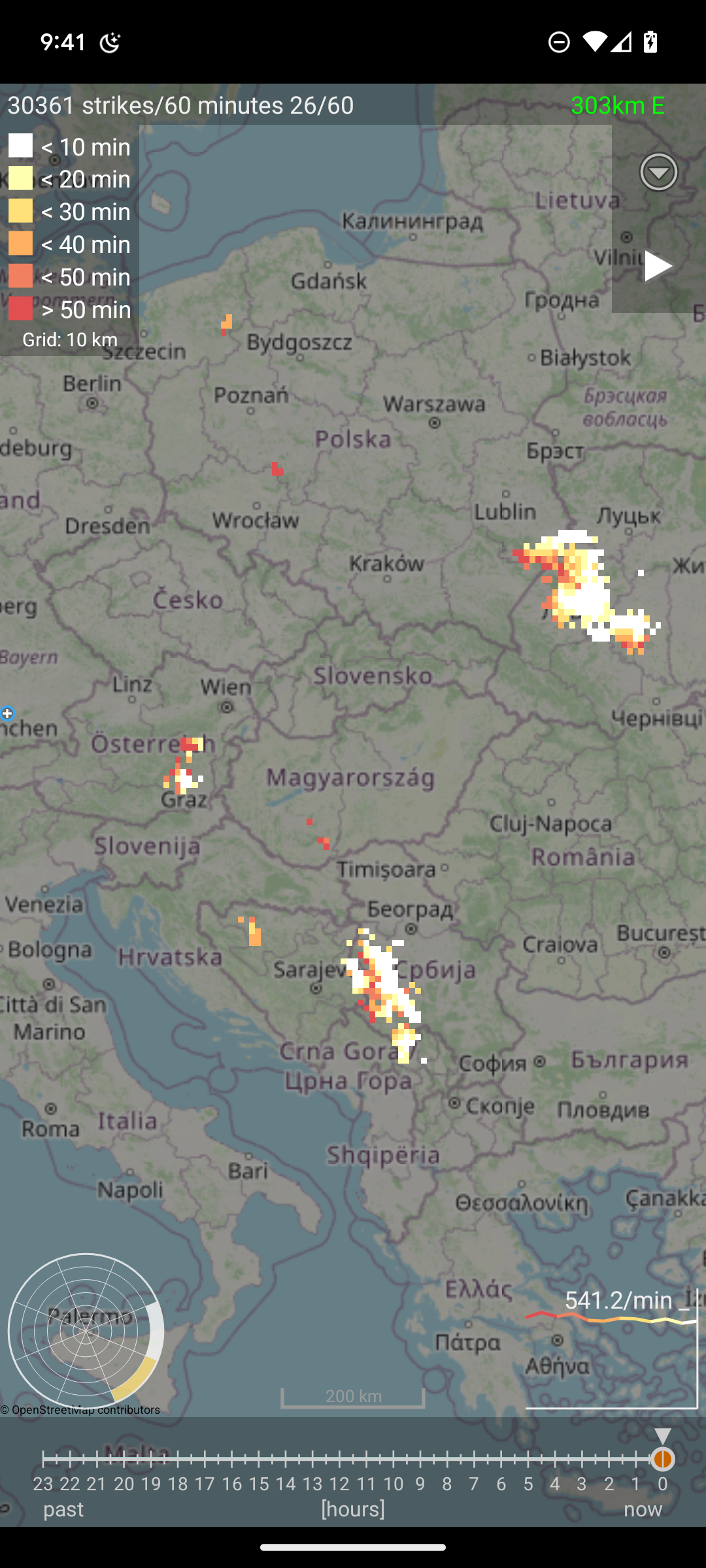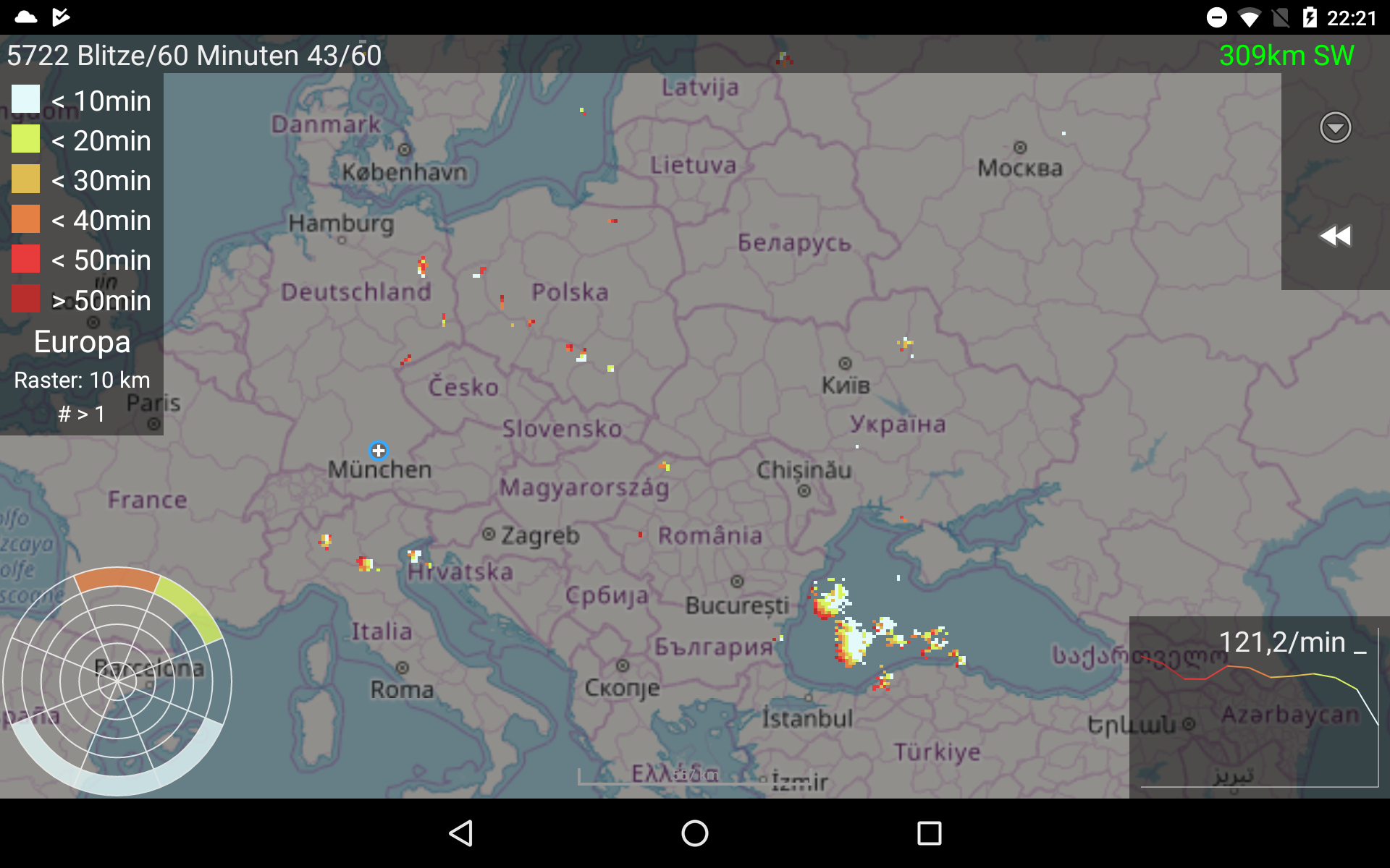 The raster display ensures a fast performance of the application even if there is a very high thunderstorm activity. Blitzortung.org participants can visualize all stroke locations individually.