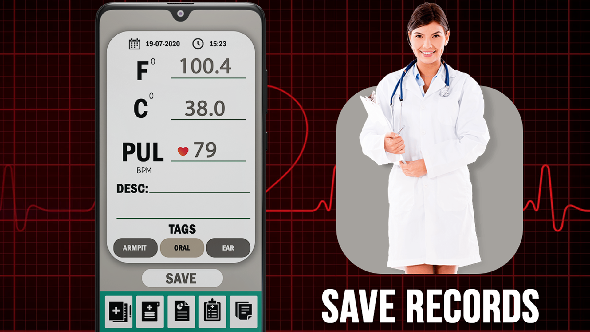 A body temperature diary application designed for patients suffering from fever. Fever Thermometer App gives you all functions you need to track, record and figure out your body temperature and pulse. Save the information with all additional data like heart rate pulse, mood or feeling at that time, where that body temperature measurement was taken. First launch the application and then enter the values and press the save button to maintain the records and later view these records. This application will keep your records safe and later will present you the data in most amazing and logical forms. This application will create charts and graphs on the basis of entered data.