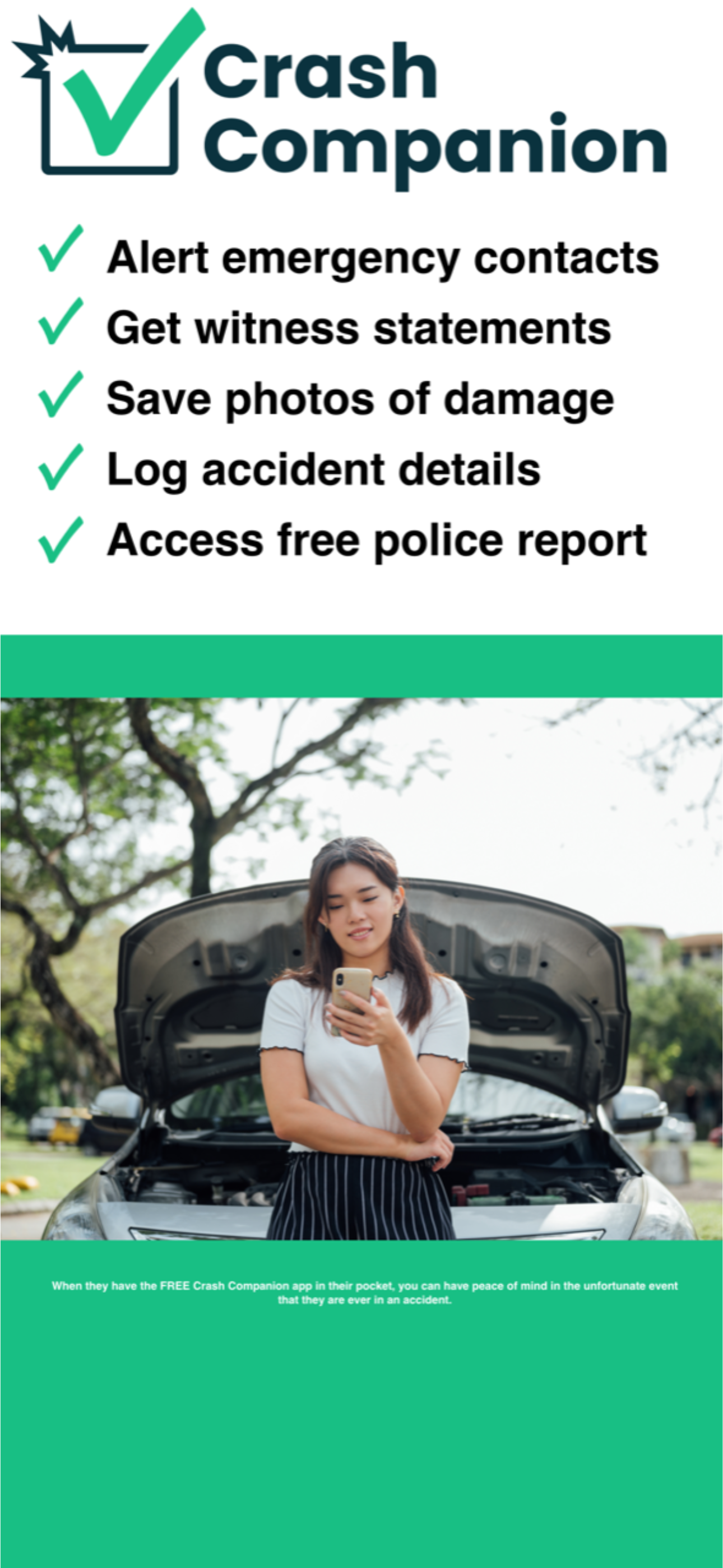 Getting into a car accident can be stressful and a lot of people don’t know what to do. And the police may no longer come to every accident scene, which can cause even more confusion. The FREE Crash Companion App is the go-to app for helping you gather and document information about your car accident and providing guidance on all of the next steps. It even notifies emergency contacts of an accident and shares the GPS location. Parents should download this for their kid’s phones. When they have the Crash Companion in their pocket, you can have peace of mind knowing that they’ll always know exactly what to do in the unfortunate event that they are ever in an accident.