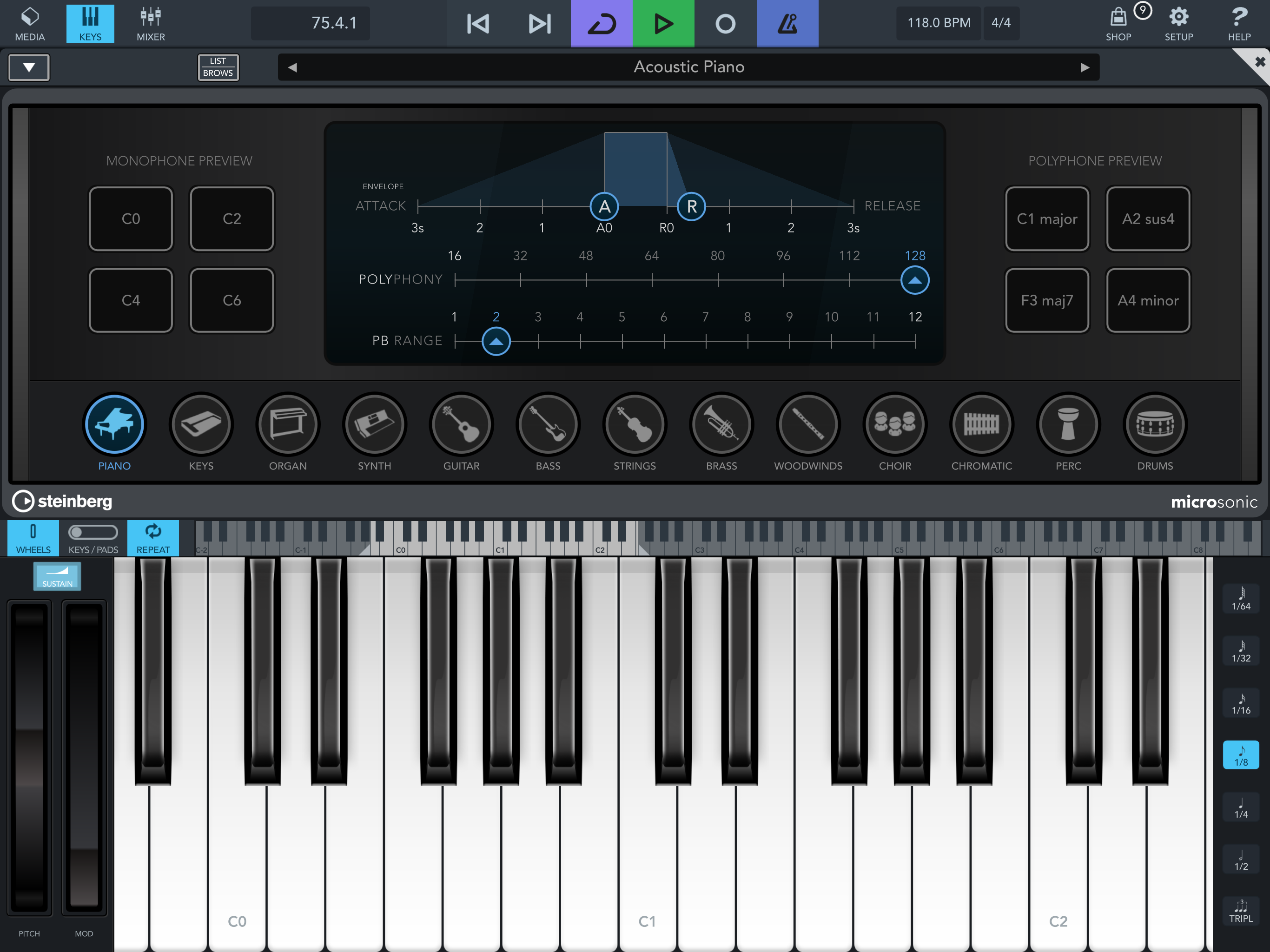 • Virtual keyboard with note repeat control