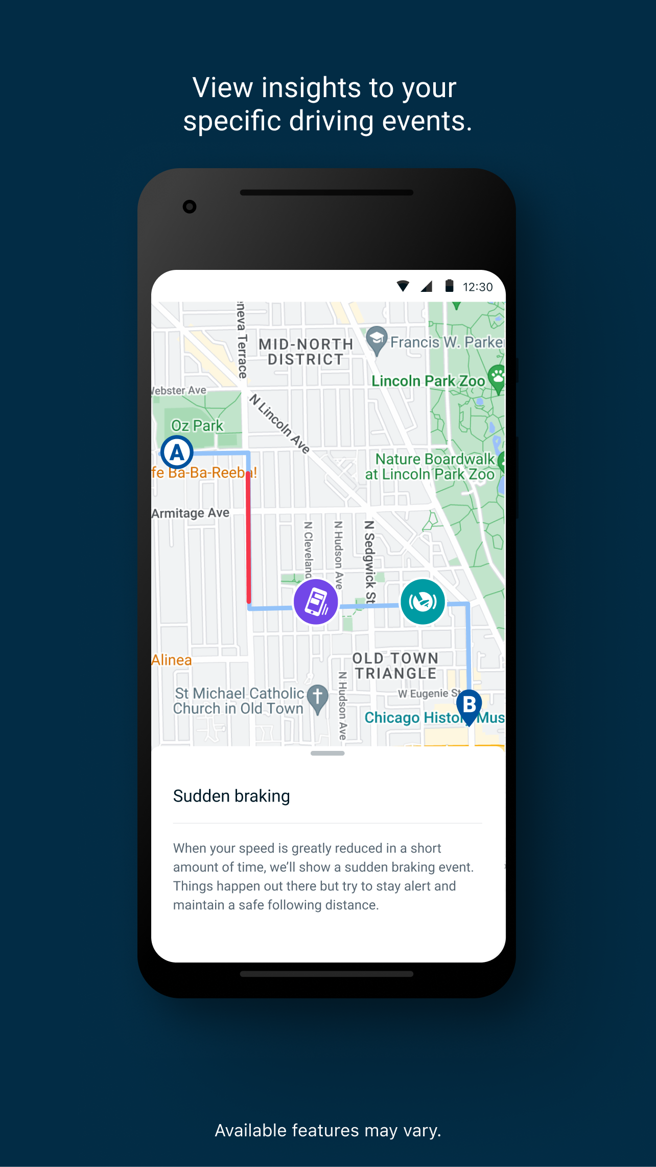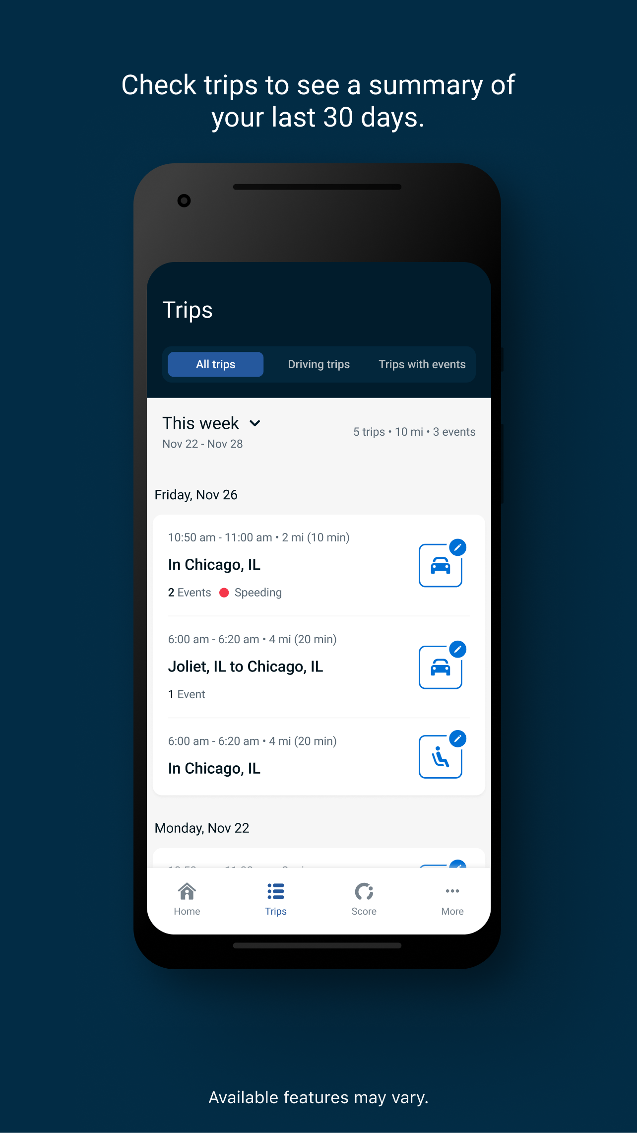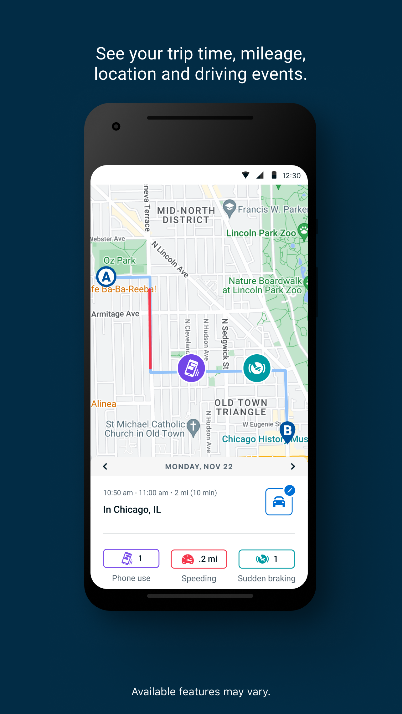 • Review detailed maps of previous trips to track how often you’re driving, how far you’re driving, and how safely you’re driving.