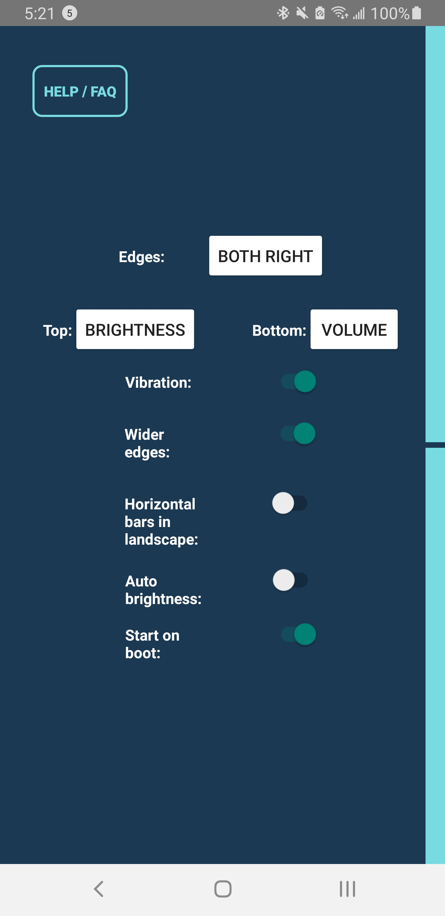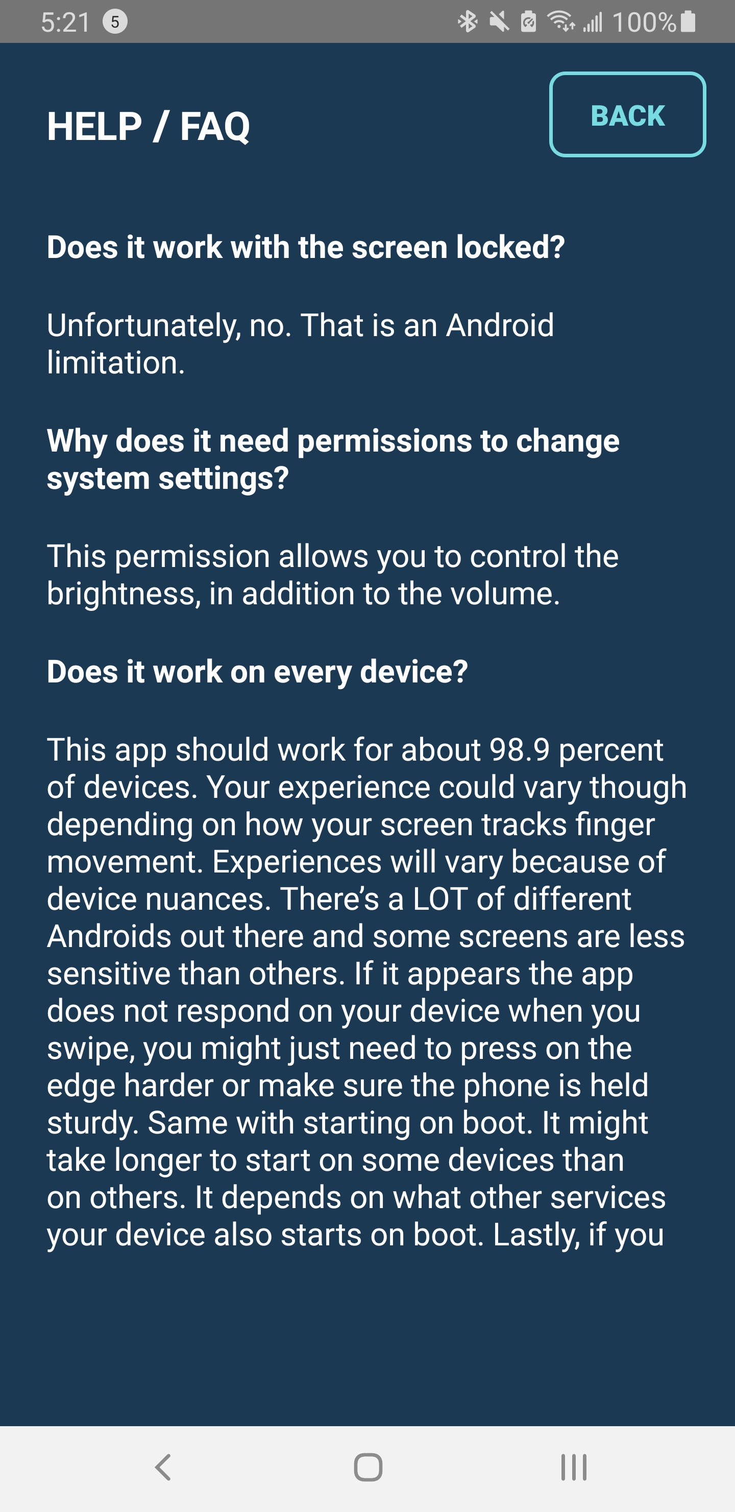 This app should work for about 98.9 percent of devices. Your experience could vary though depending on how your screen tracks finger movement. Experiences will vary because of device nuances. There’s a LOT of different Androids out there and some screens are less sensitive than others. If it appears the app does not respond on your device when you swipe, you might just need to press on the edge harder or make sure the phone is held sturdy. Same with starting on boot. It might take longer to start on some devices than on others. It depends on what other services your device also starts on boot. Lastly, if you have other apps running that use overlays, your device may struggle figuring out what app to register the touch for. Consider getting to know how the app responds on your device before sending a support request.