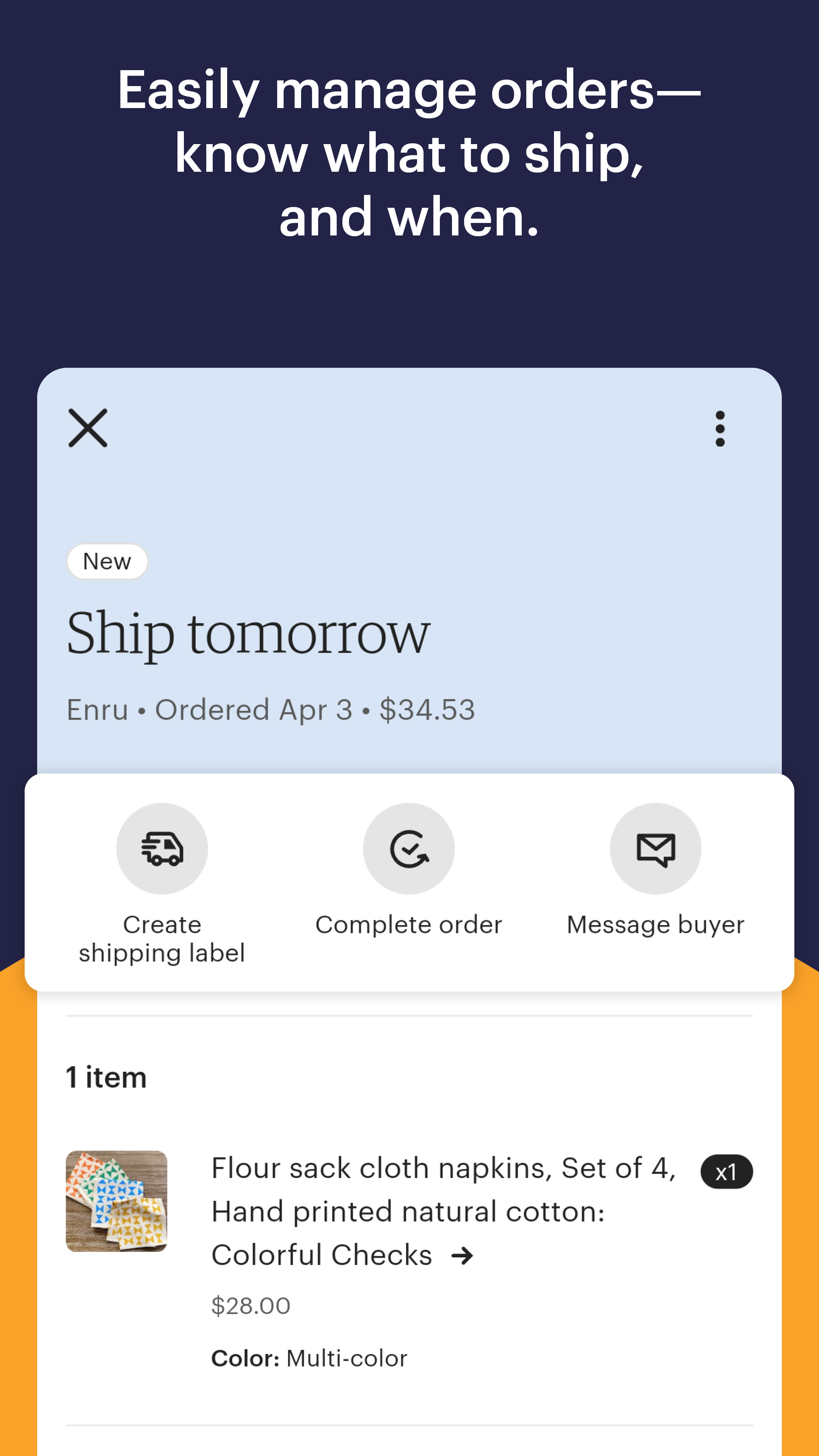 Etsy Seller is the newest way to manage your shop on the go. It’s got everything you need to easily respond to customers, create and edit listings, see your shop stats, and manage your orders.