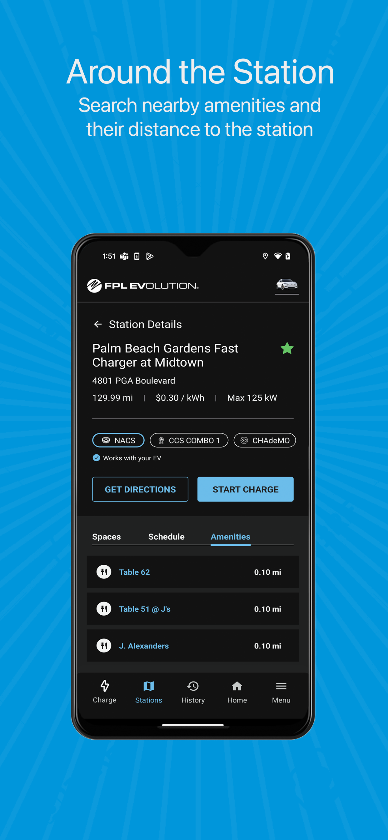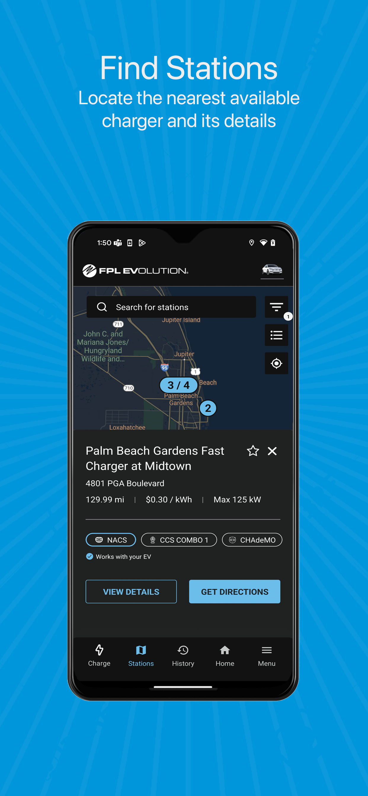 FPL EVolution® is increasing the number of EV charging stations throughout Florida by 50 percent and growing an 800-mile network of universal fast chargers conveniently located along major corridors. Download the FPL EVolution app to find and navigate to the closest FPL EVolution charger and start charging. The app is available to FPL customers and guests.