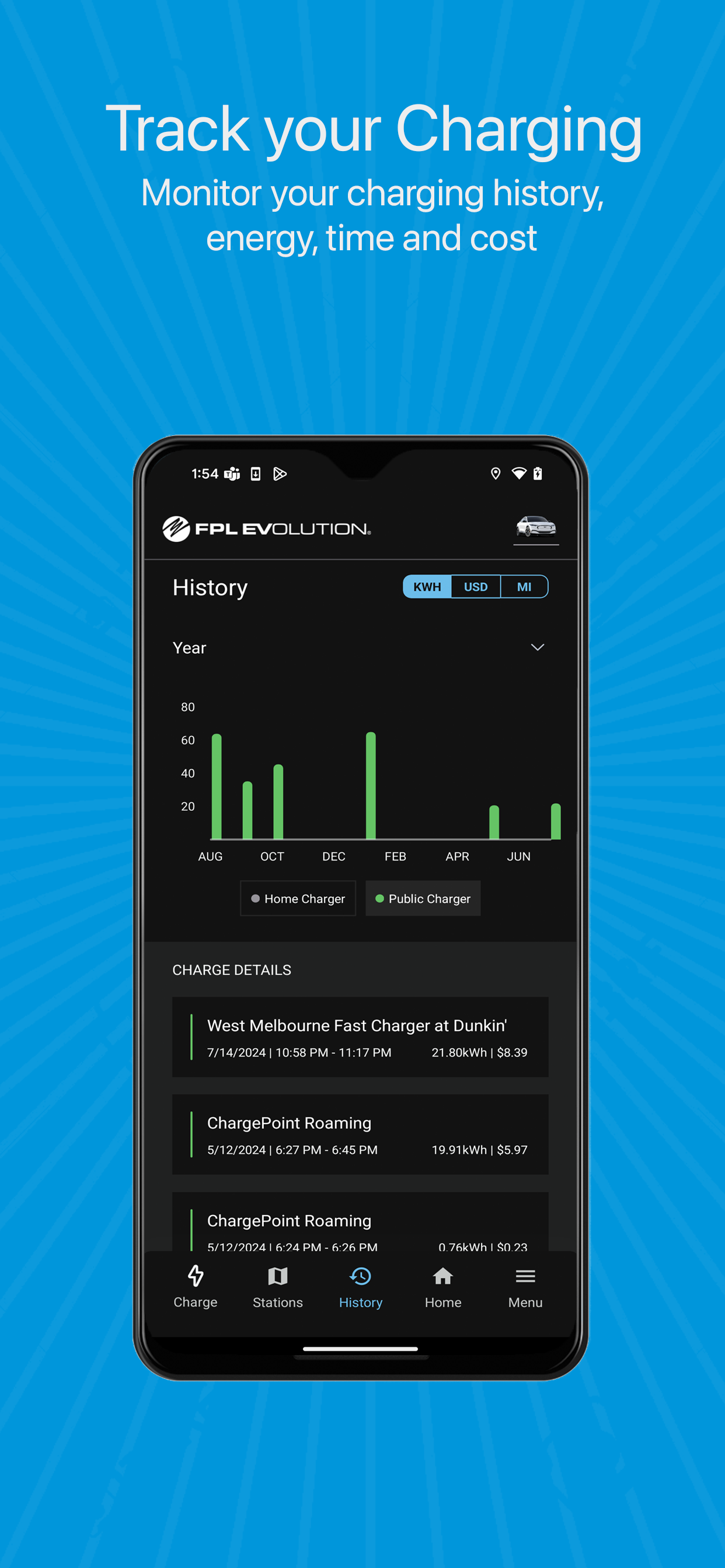 Create a user profile: See your charging history and trends, including miles added and cost.