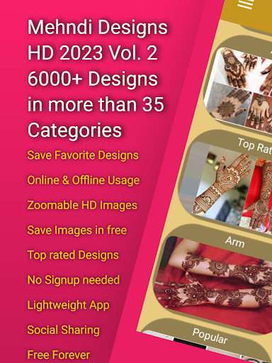 Mehndi Design 2023 is used by famous mehndi/makeup artists and is their favorite mehndi design app. Download this app and make your hands beautiful like never before. Mehndi Design 2023 has the latest Mehndi designs for all cultures. This app includes Pakistani Mehndi Designs, Indian Mehndi Designs, Arabic Mehndi Designs, Indo-Arabic Mehndi Designs, African Mehndi Designs, Moroccan Mehndi Designs, Western Mehndi Designs, Indo-Western Mehndi Designs, in following categories.