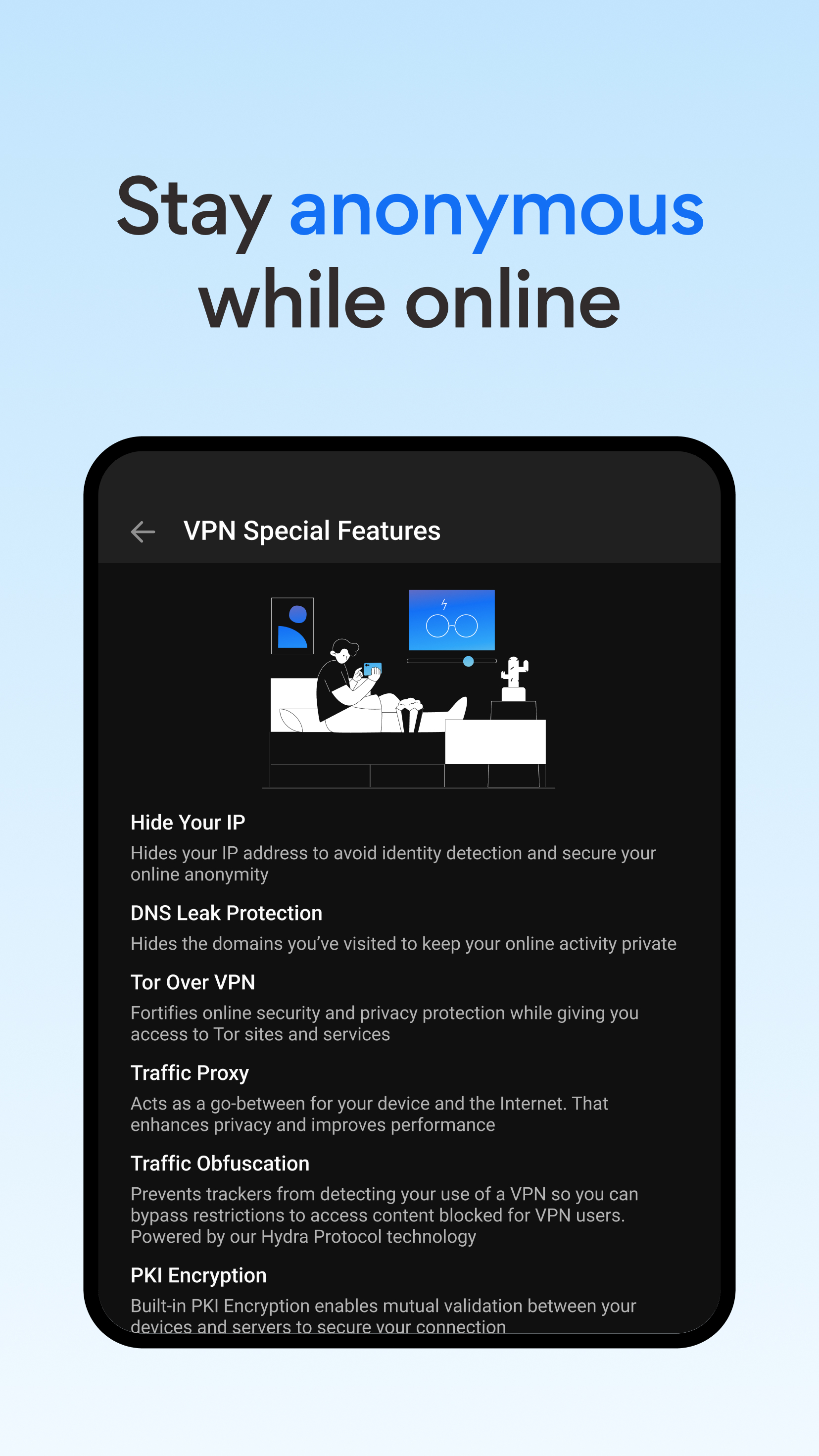 Use the basic features in an ad-supported, free version or upgrade to premium for the best experience—including unlimited VPN bandwidth, 115+ virtual VPN locations, and 24/7 support.