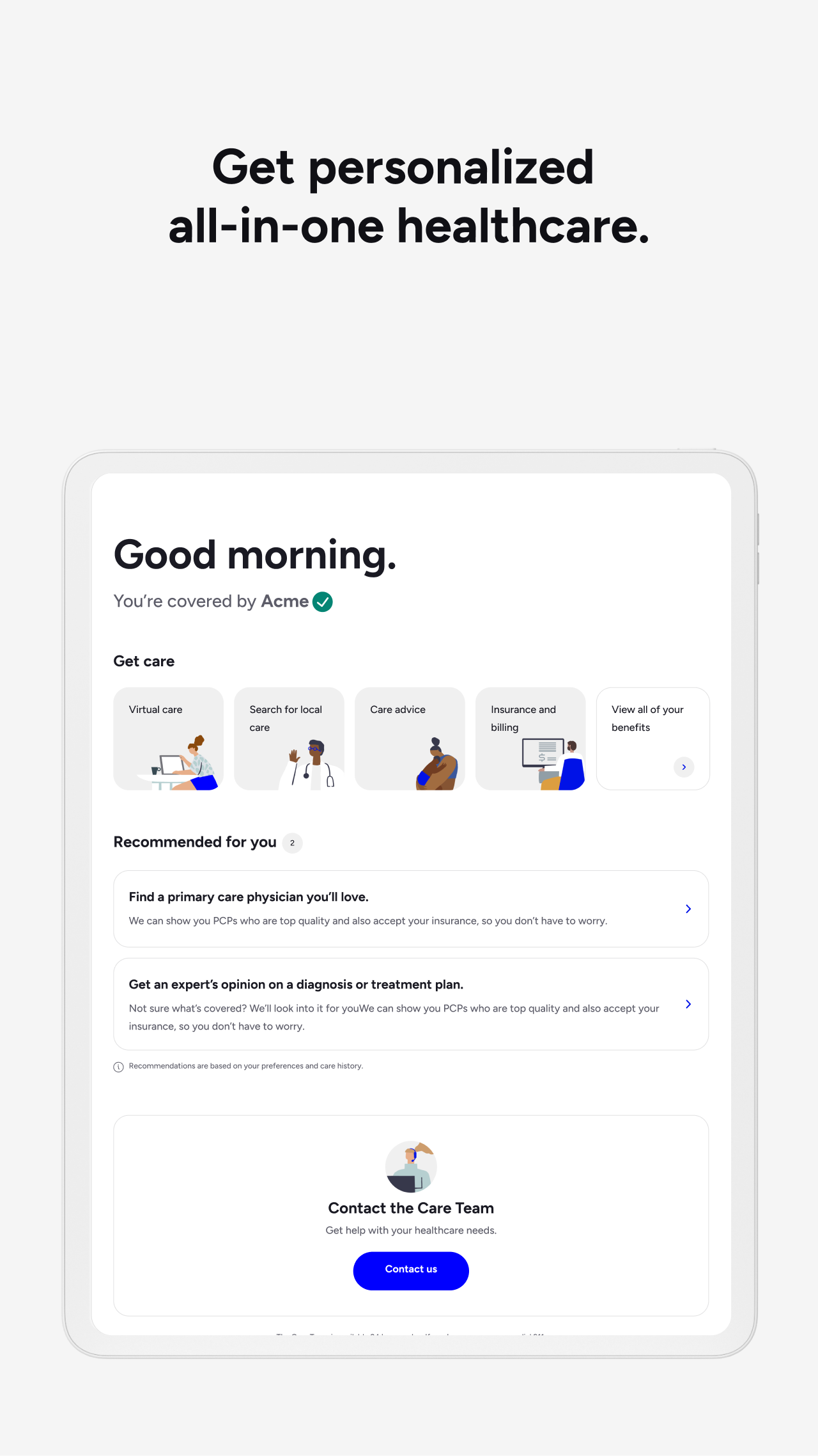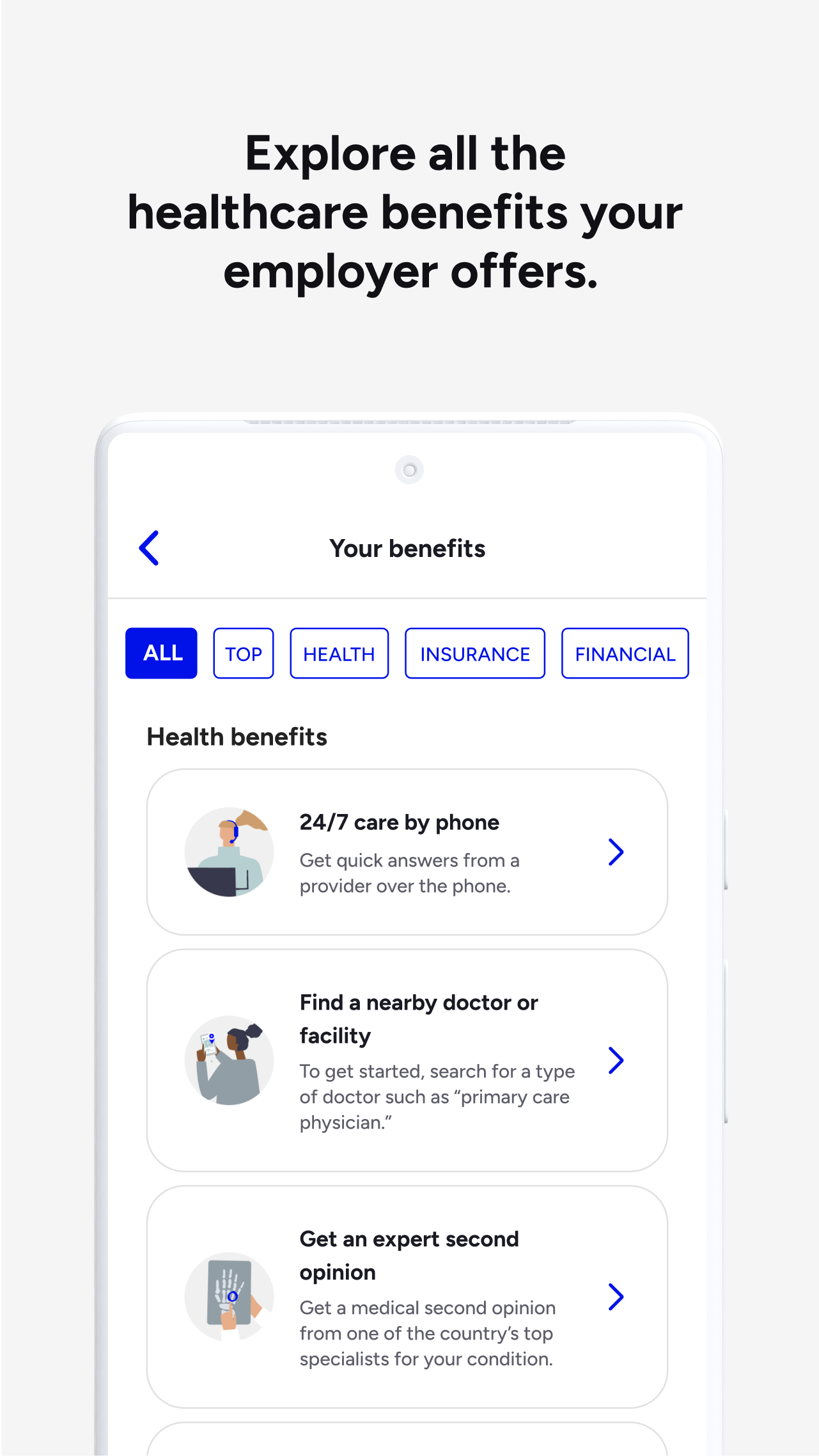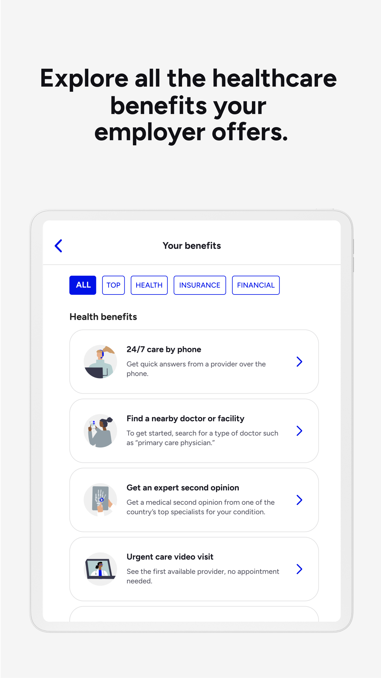Included Health is a healthcare benefit provided by employers to help members track healthcare spending, find a high-quality doctor, get 24/7 health advice, and more. We’re not an insurance company, but a team of healthcare experts available over the phone, in the app, or online.