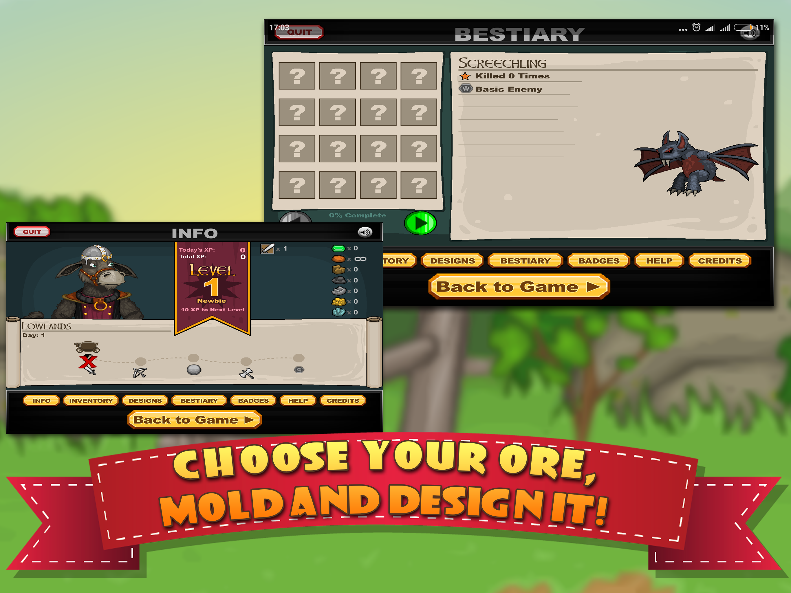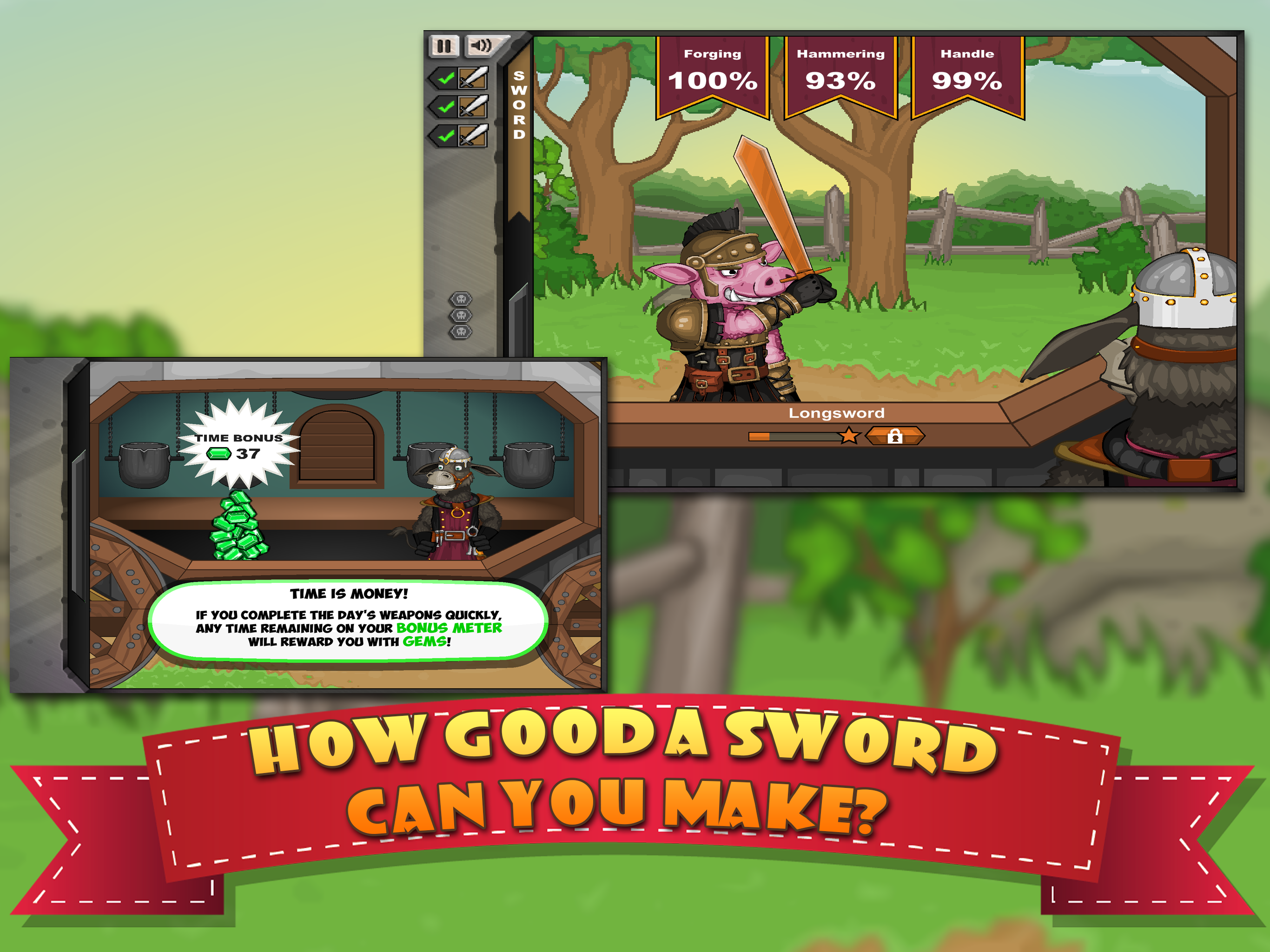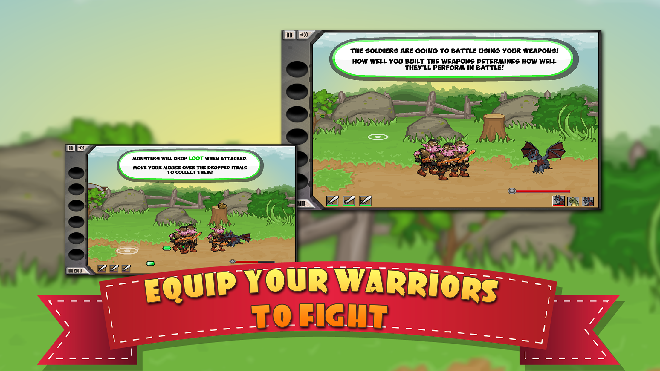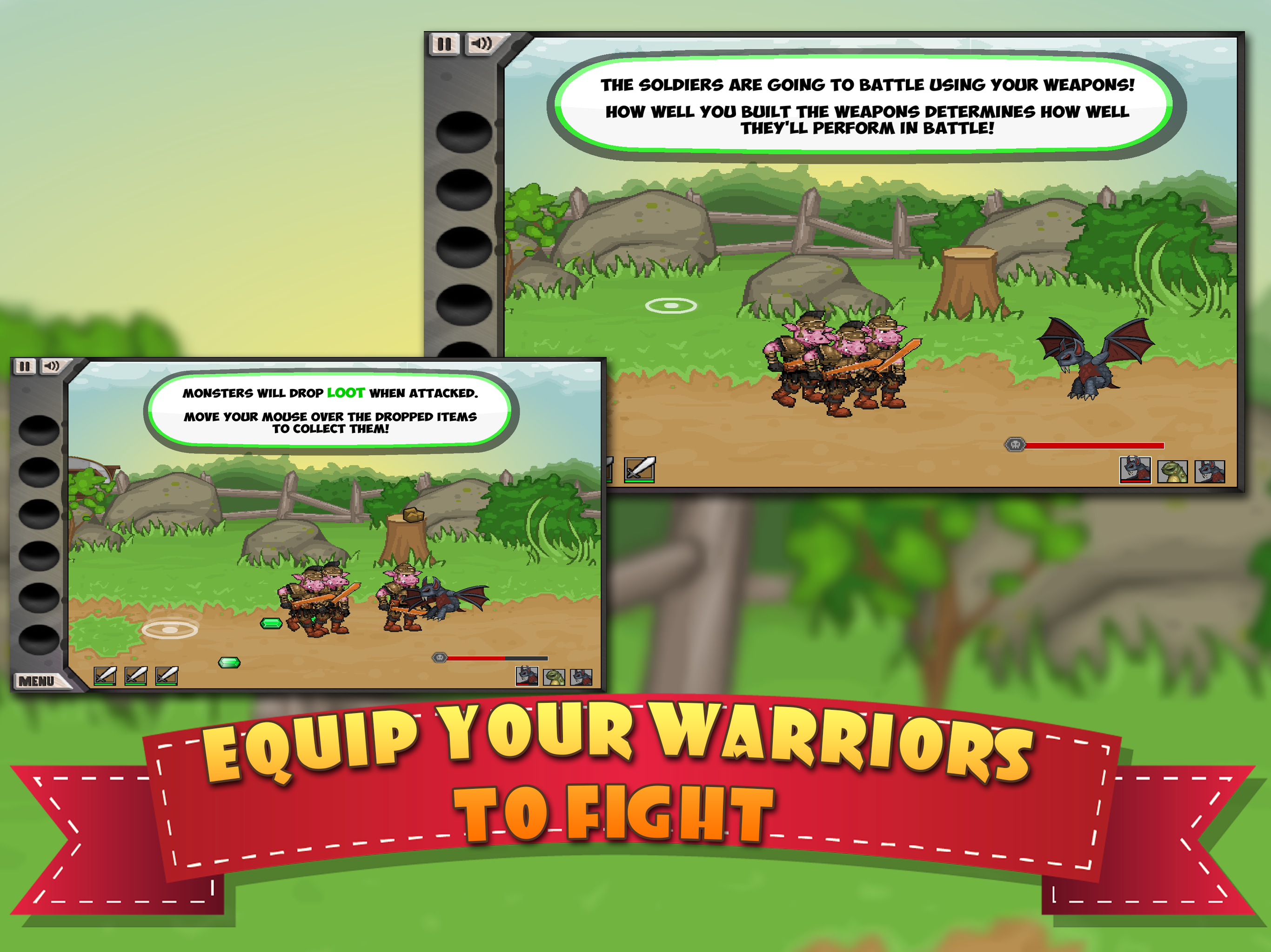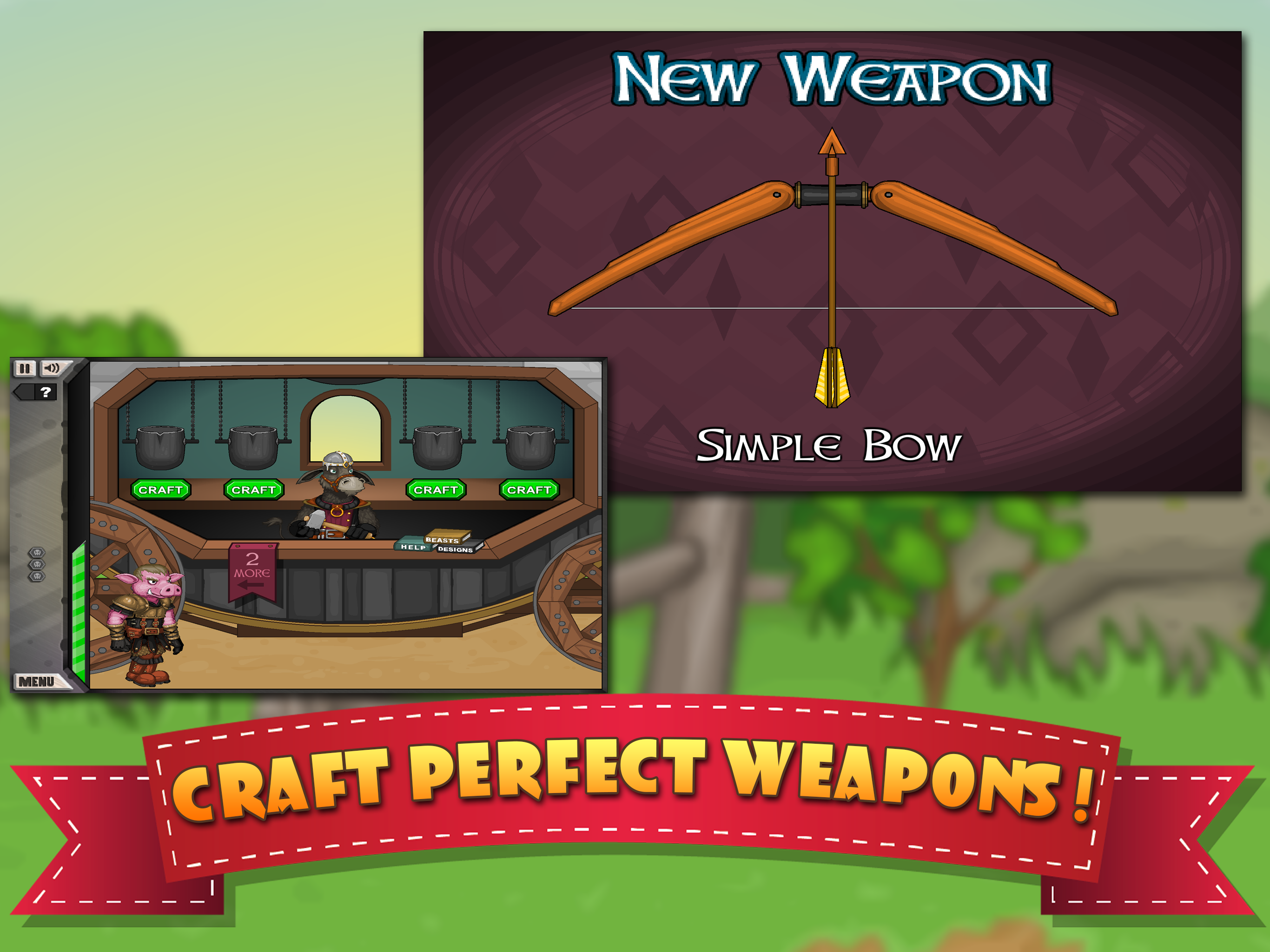 , you are a blacksmith crafting a wide range of weapons for all of your warriors. Crafting weapons is completely hands-on. Choose your ore, choose your mold, melt it, pour it, construct it, and design it. Whether it's swords, bows, arrows, axes, or others things, you'll need skills and strategy to make the perfect weapon. After crafting, it's off to battle with your team of warriors. As they fight, you gather loot and man the cannons, and keep making progress towards the Great Wizard Dudley!
