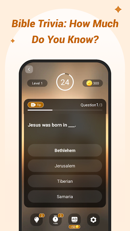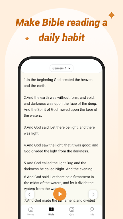 Quiz: Engage with Scripture in a fun and meaningful way by testing your Bible knowledge. Answer questions based on what you’ve read to reinforce your understanding of key Bible stories, verses, and principles. The quiz feature provides a helpful way to reflect on your learning and deepen your knowledge of the Bible.