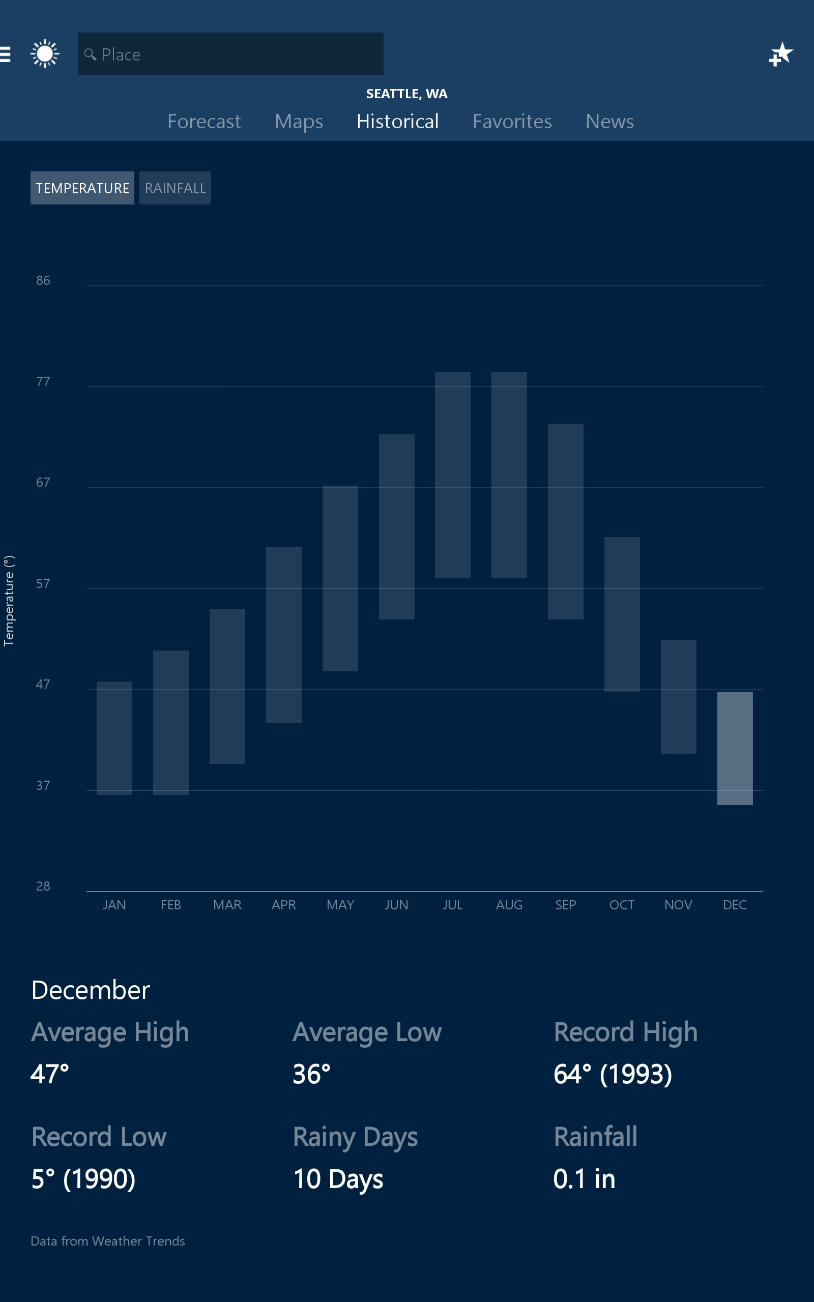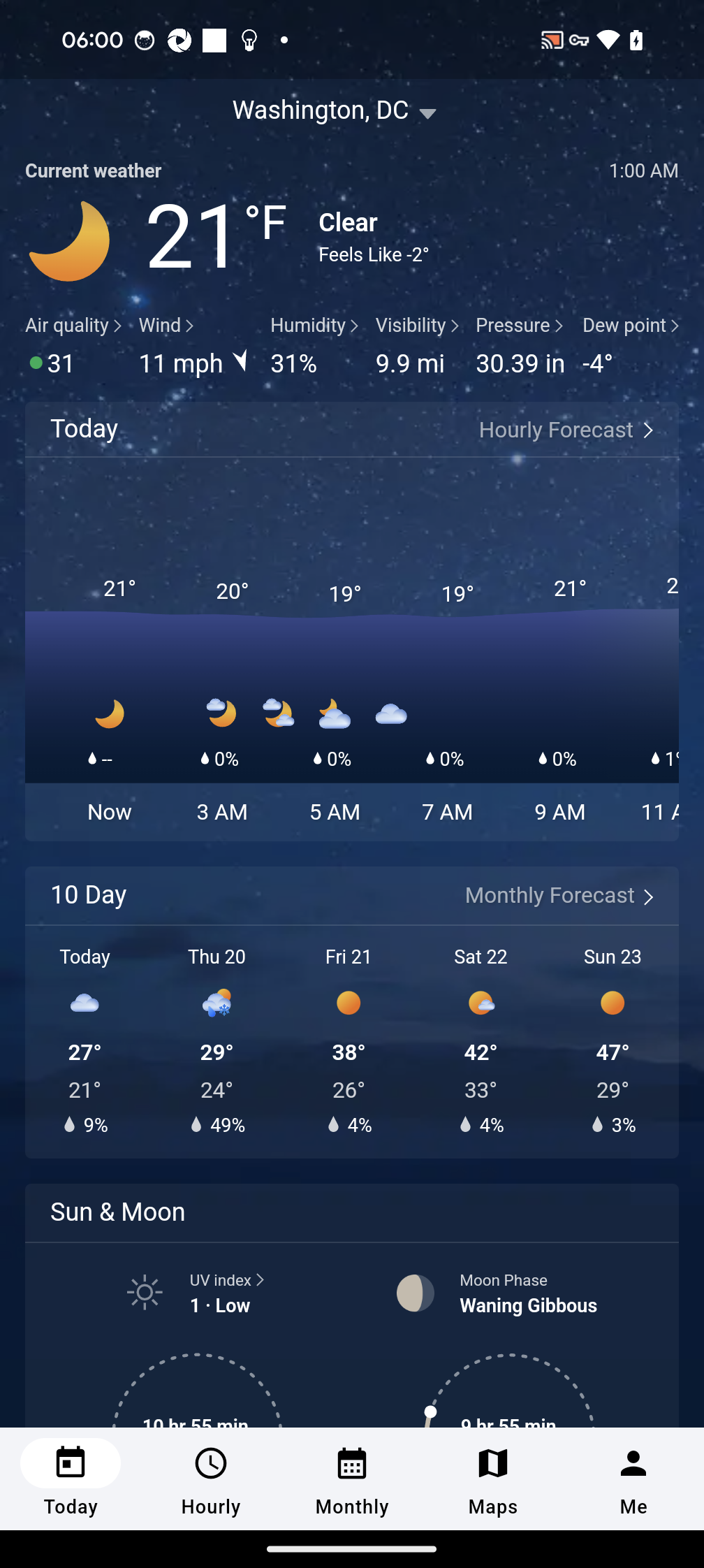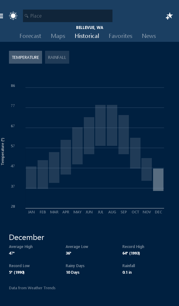 Quickly access the day drill down, hourly, daily, and 10-day forecasts, and historical weather averages. Check wind, visibility, humidity, barometer, dew point, and chance of precipitation. See sunrise, sunset, moon phase, and UV index.