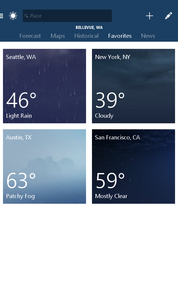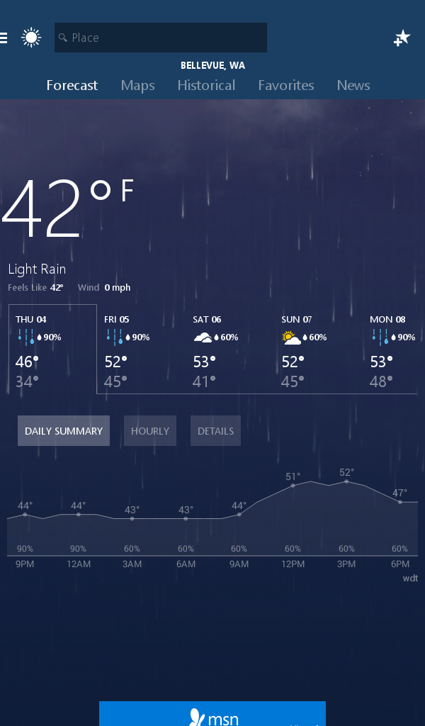 Automatically sync your favorite cities across MSN Weather on the web and your mobile apps for quick access to the places you care about.