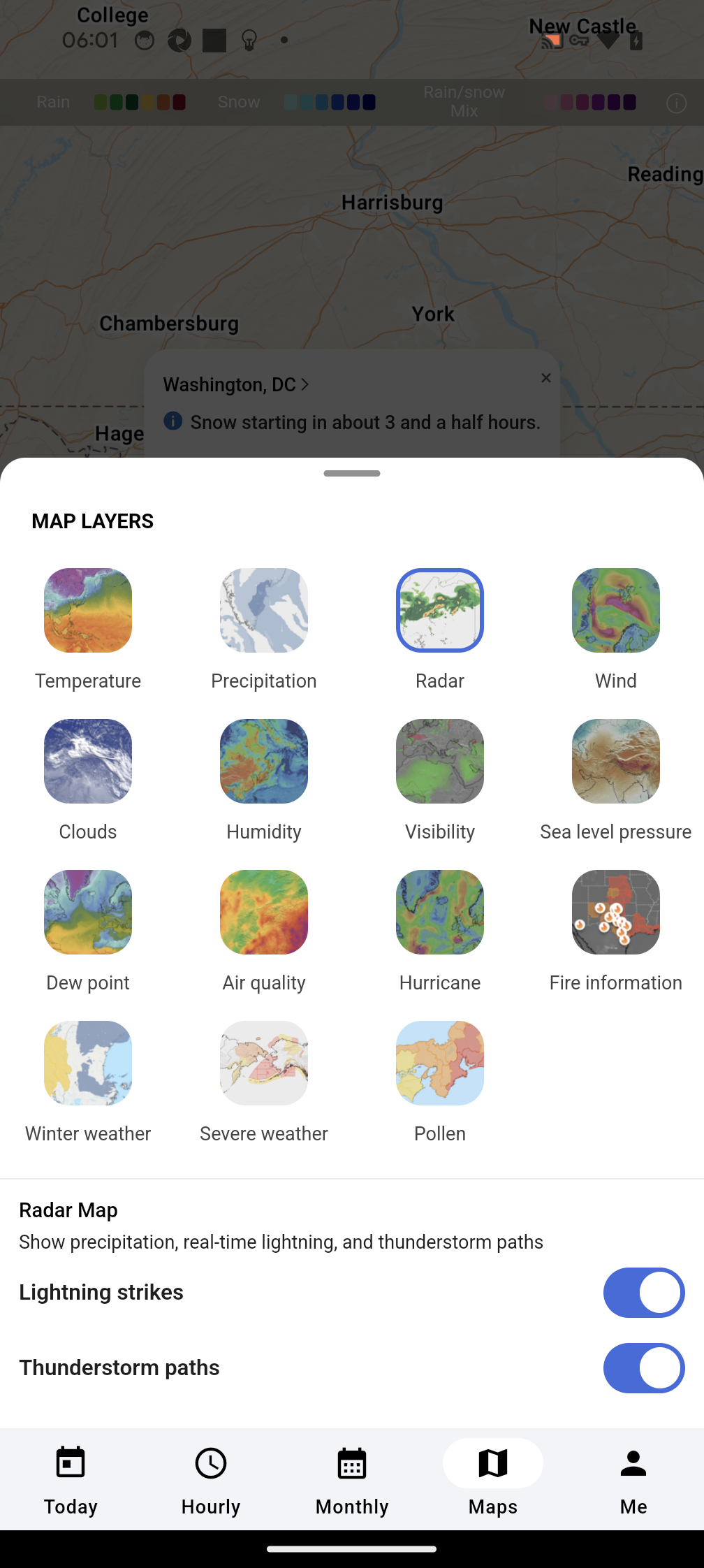 Go deep in detail with temperature, radar observation, radar forecast, precipitation, cloud and satellite maps.