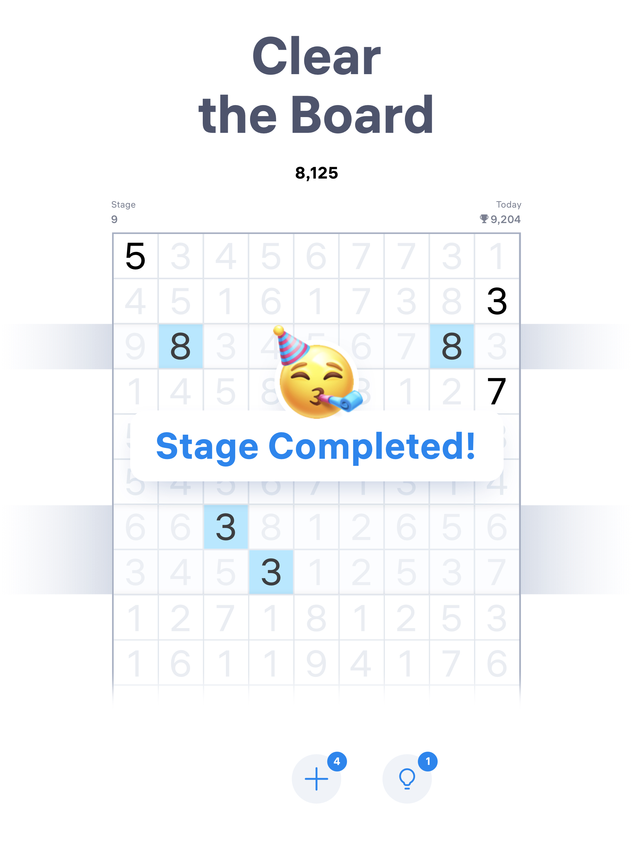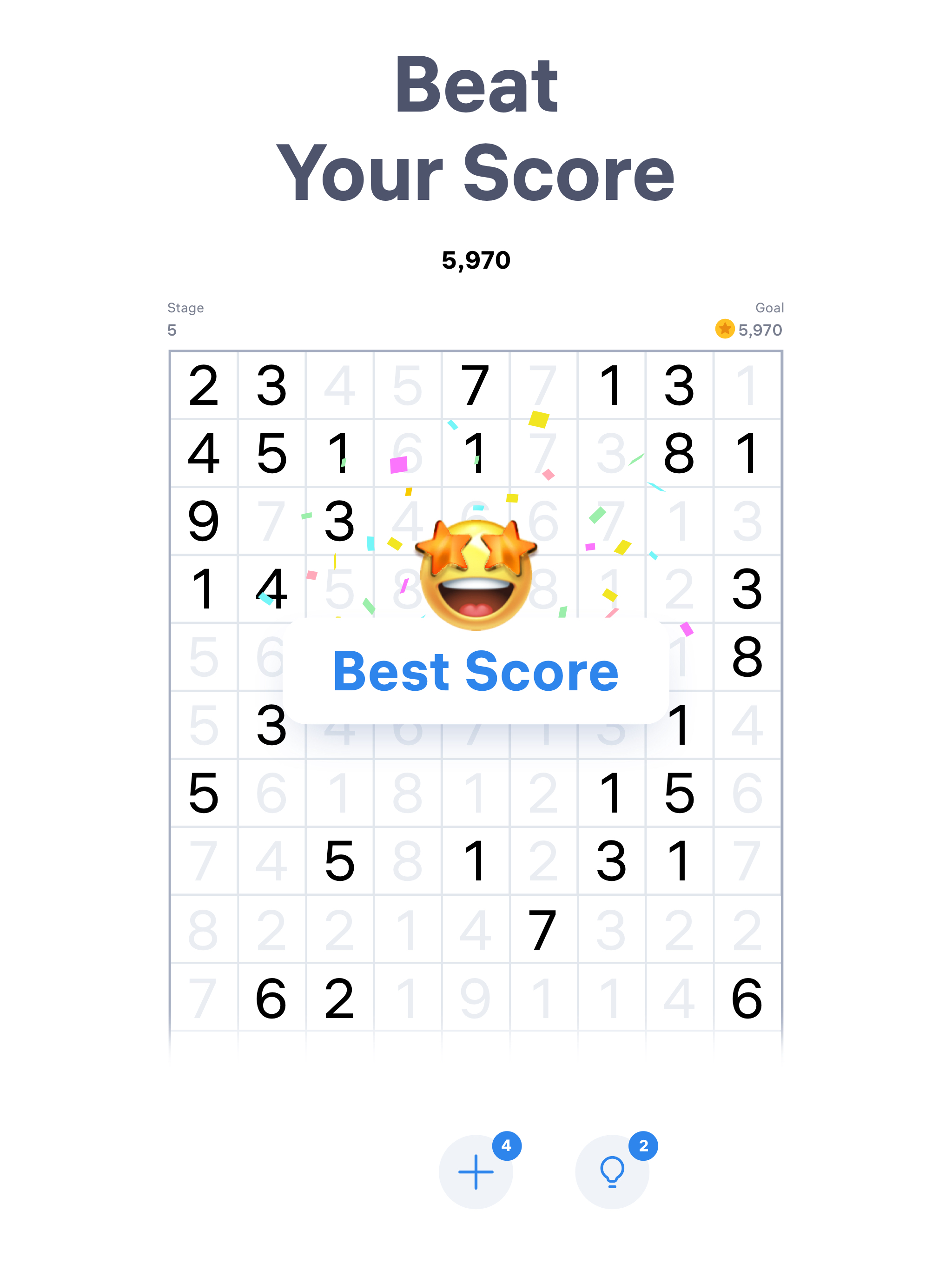 The emptier the board is, the better your score! Score the most points by crossing out all the numbers on the field (+150 points), and removing rows (+10 points). Score +4 points by connecting numbers that are far apart. Merge numbers and enjoy these math puzzles!