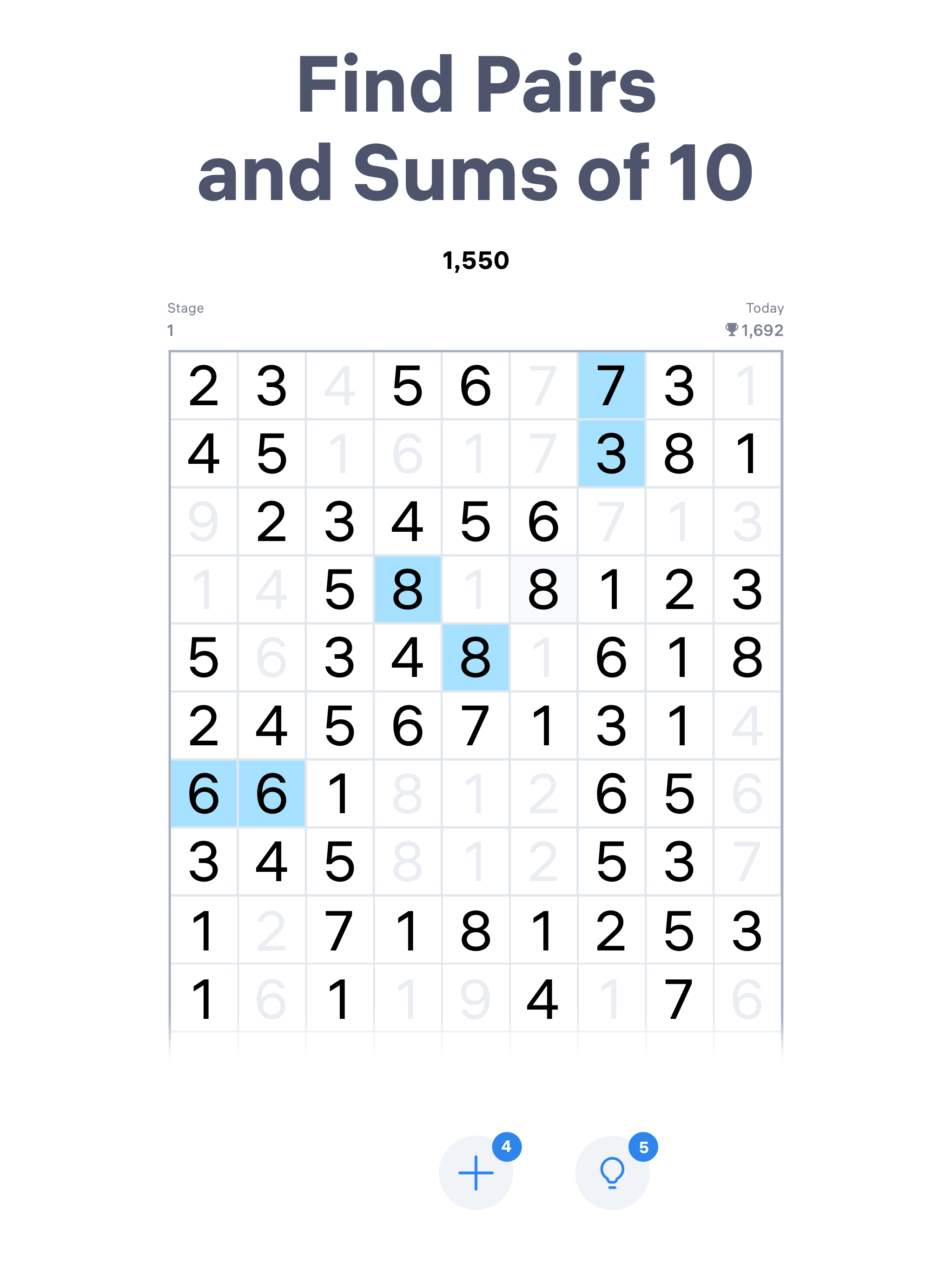 Try a mobile version of the pen and paper game from your childhood, known as Take Ten, Numberama or 10 Seeds. Now you can take your logic number game with you wherever you go. Solving free Number Match puzzles on mobile is much easier than using a pencil and paper.