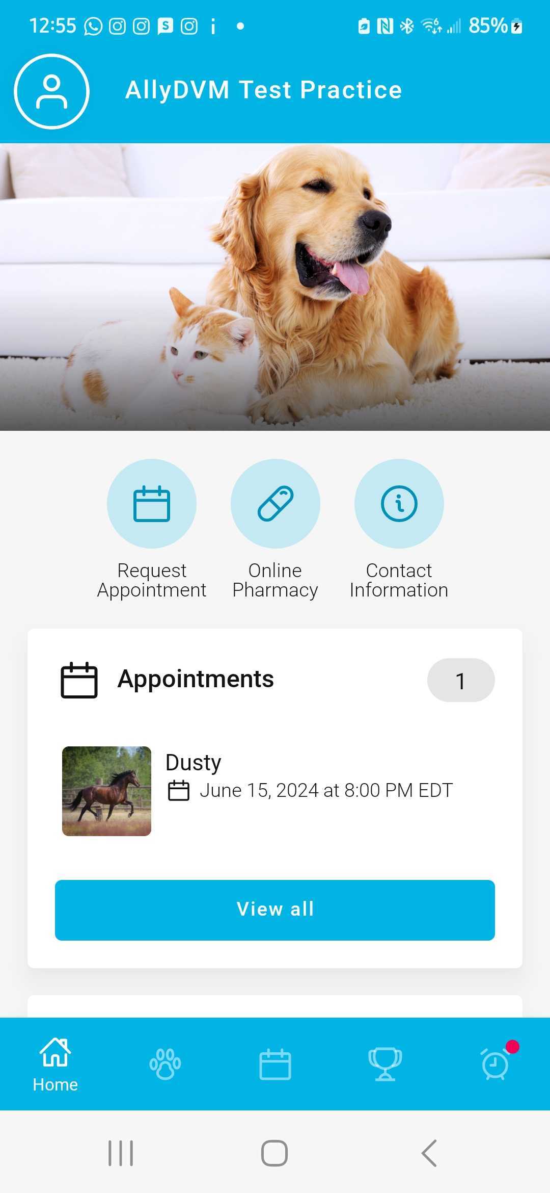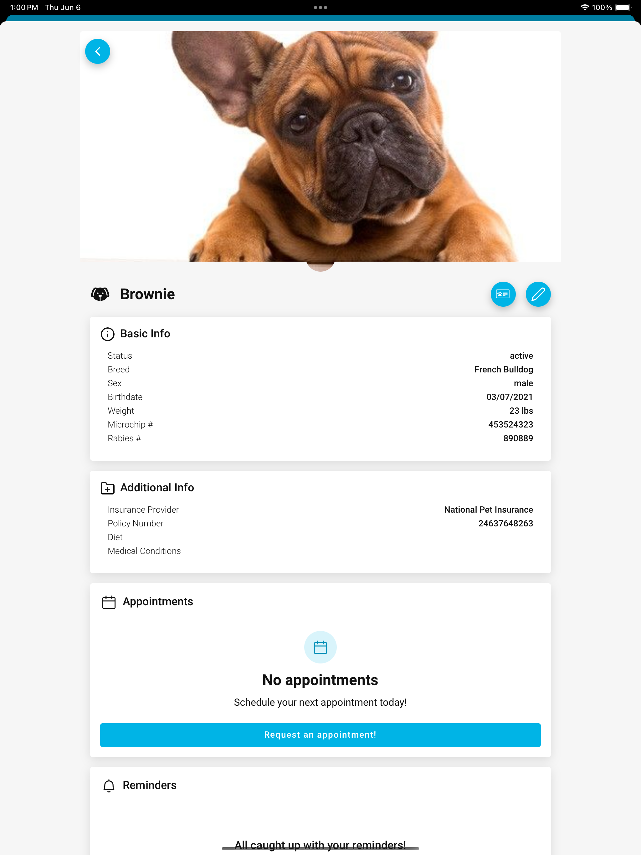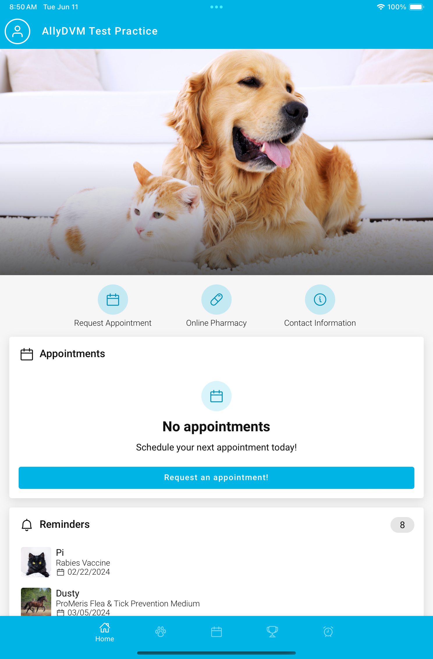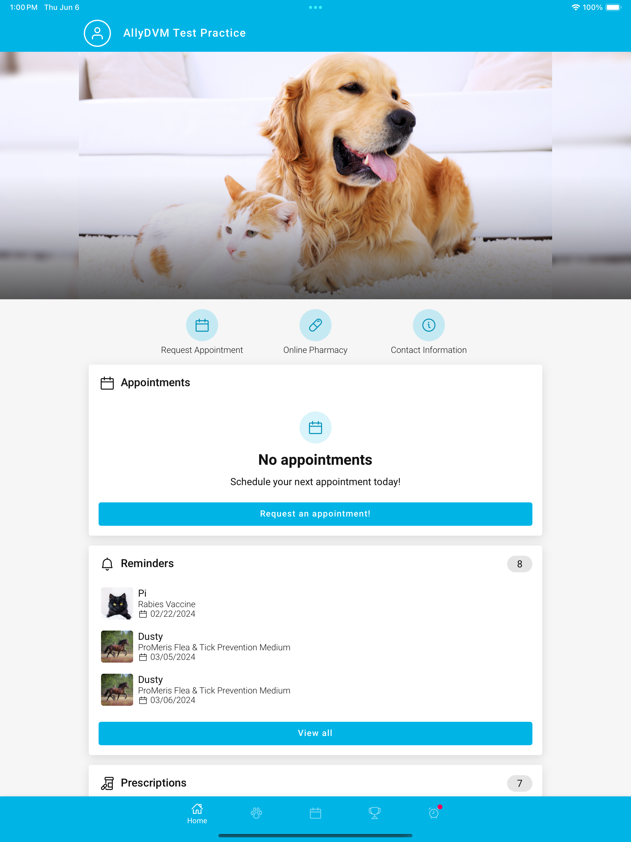 Access your pet’s information, request appointments, share their Pet ID, & more!