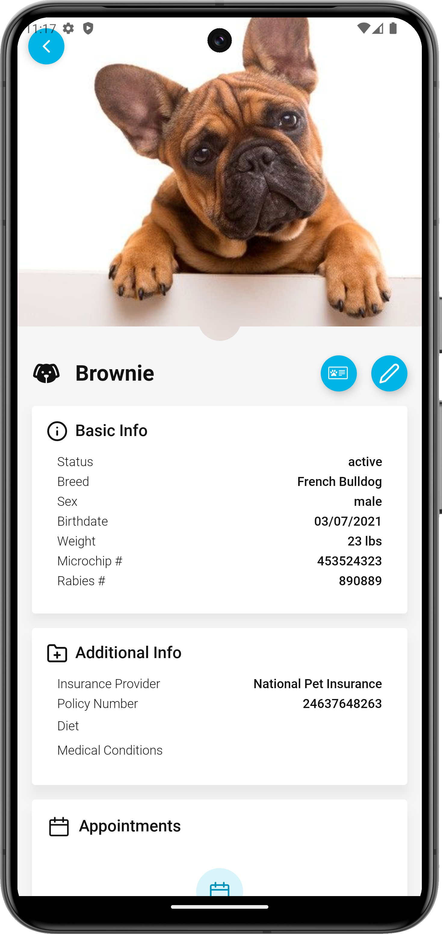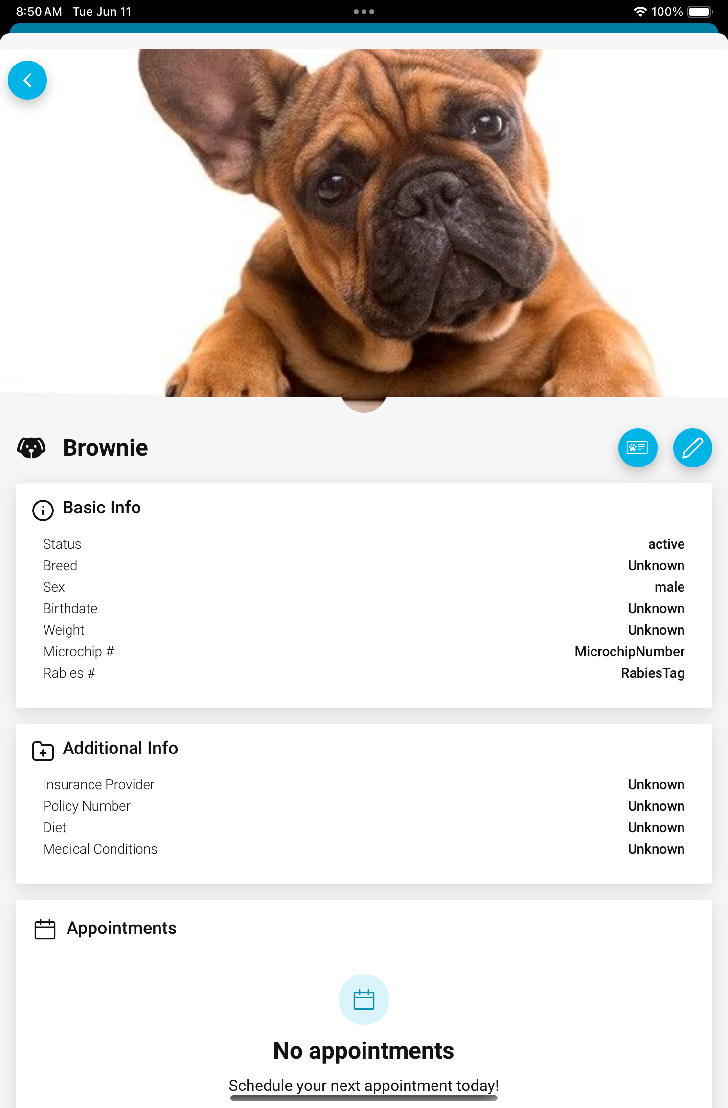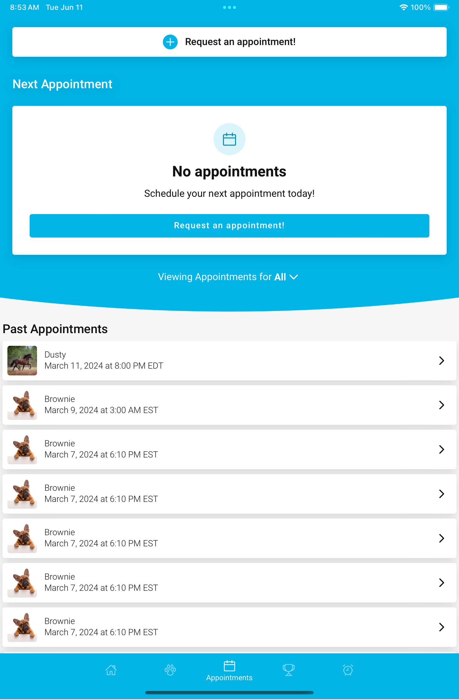 Access your pet’s information, request appointments, share their Pet ID, & more!