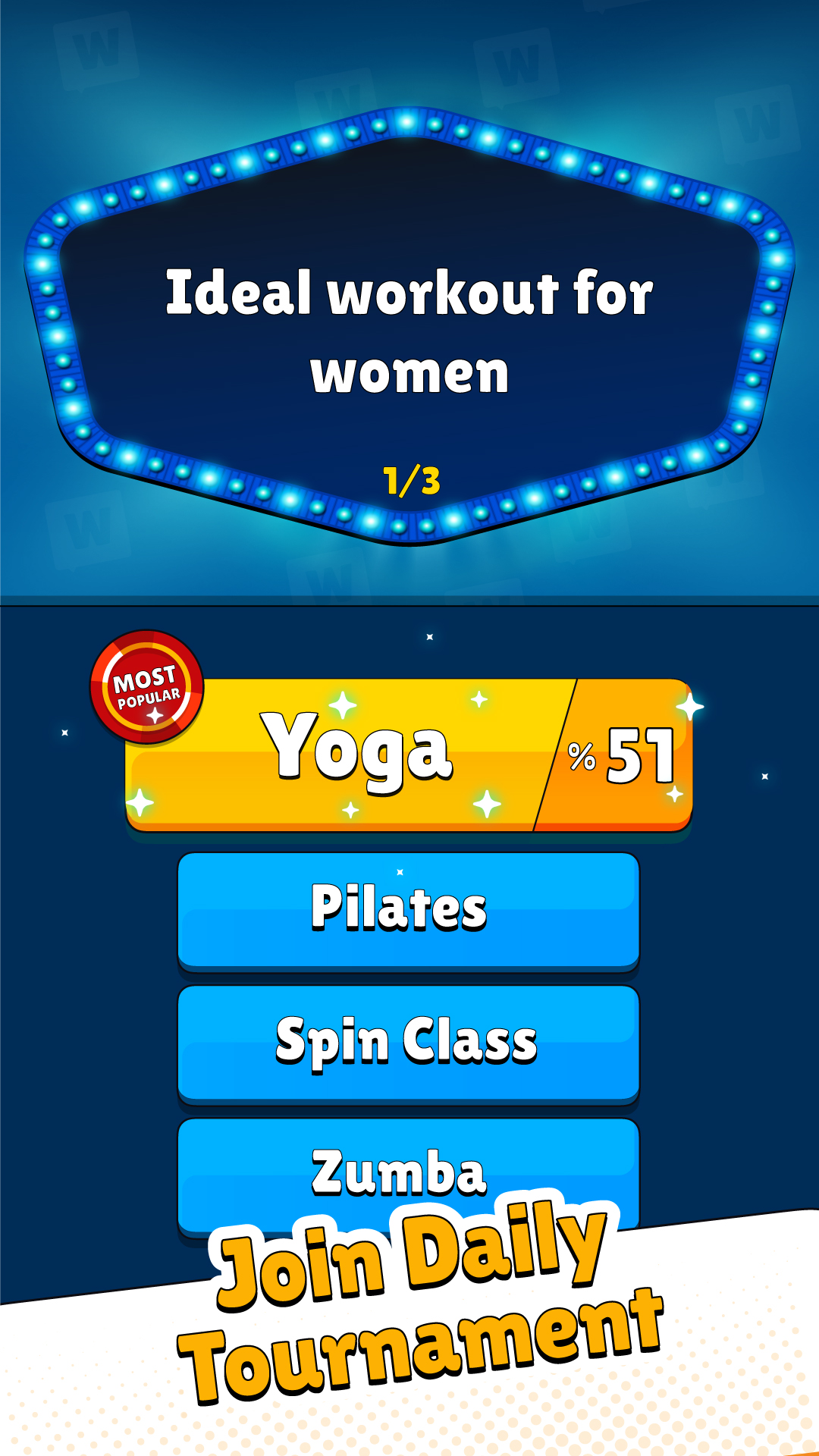 Popular Words is inspired by the TV shows such as America Says, Family Feud, and Jeopardy. You have to guess what most people say to certain questions. Each level presents a fill-in-the-blank question and five possible answers. There would be several correct answers, but you have to find the most common 5 of them whose first letters are shown to give players a hint. Blank length indicates the length of the correct word. If you like headbands games, people games and guess the word games you will enjoy this fun word trivia game too.