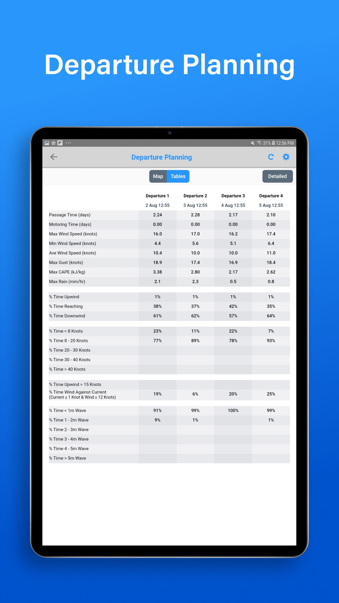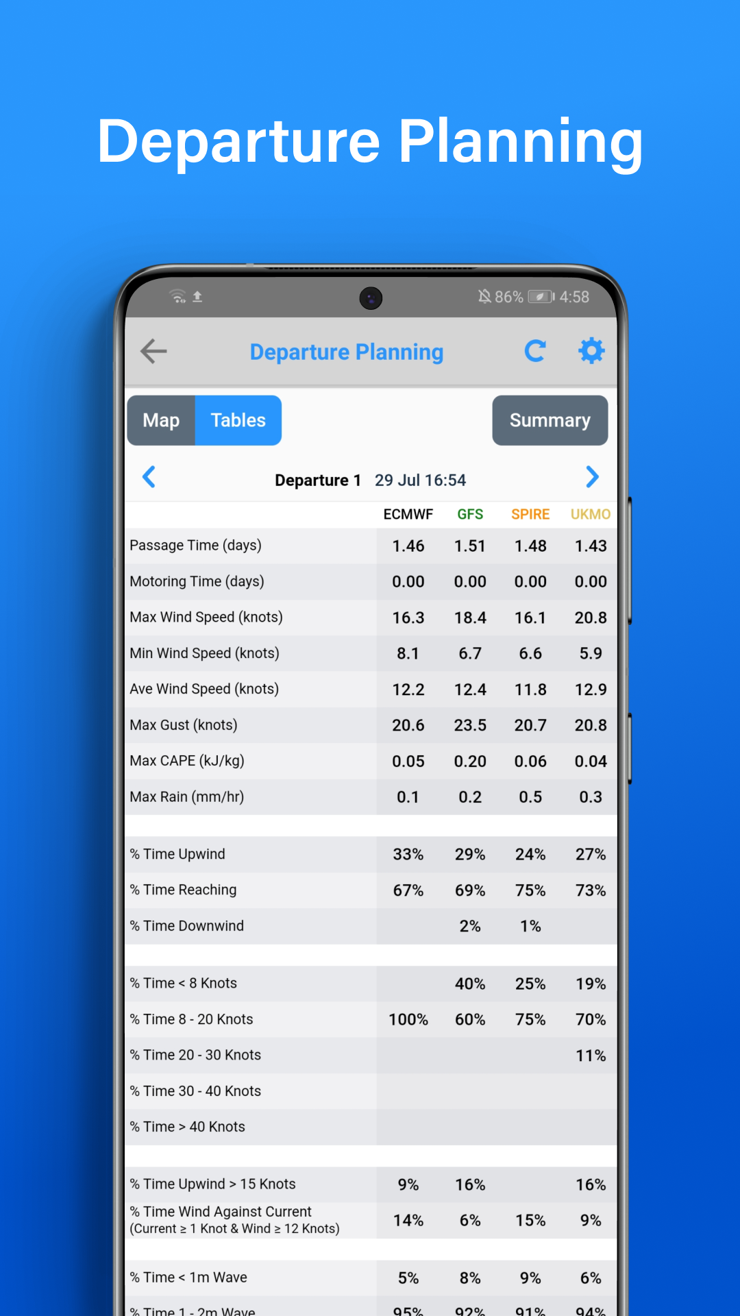 Departure Planning quickly summarizes the forecast marine weather conditions you’ll encounter along your route if leaving on day 1, 2, 3, or 4. Use this data to select the perfect departure date, every time for your Sailing Yacht or Powerboat.