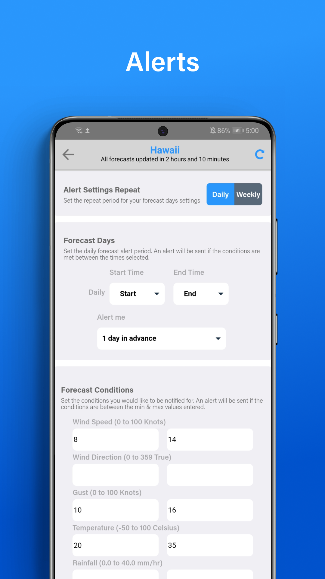 - Weather Alerts: Set your preferences then get alerts when conditions are just the way you like them for Wind, wave and other parameters.
