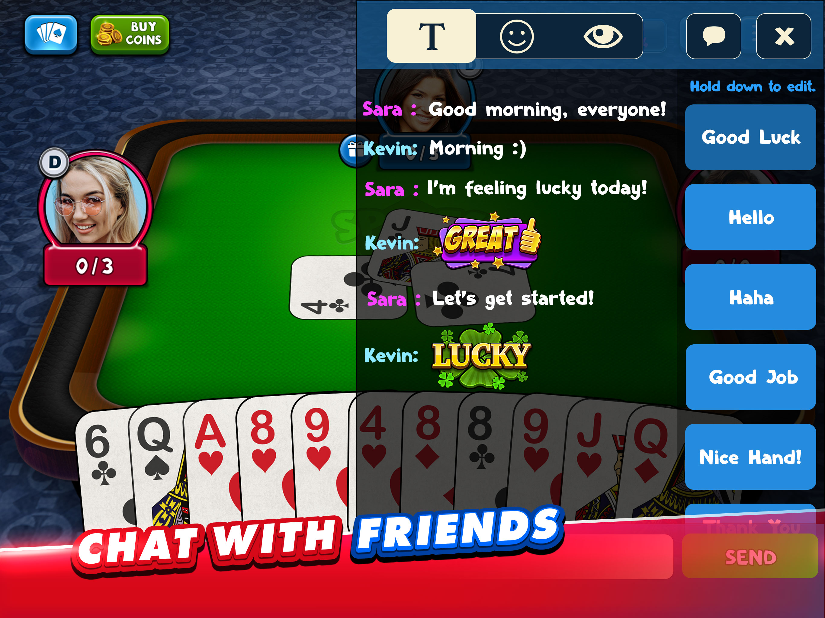 Meet new people and add them as friends to play card multiplayer games! Use Public or Private Chat to stay in touch with other players - play solitaire card games.
