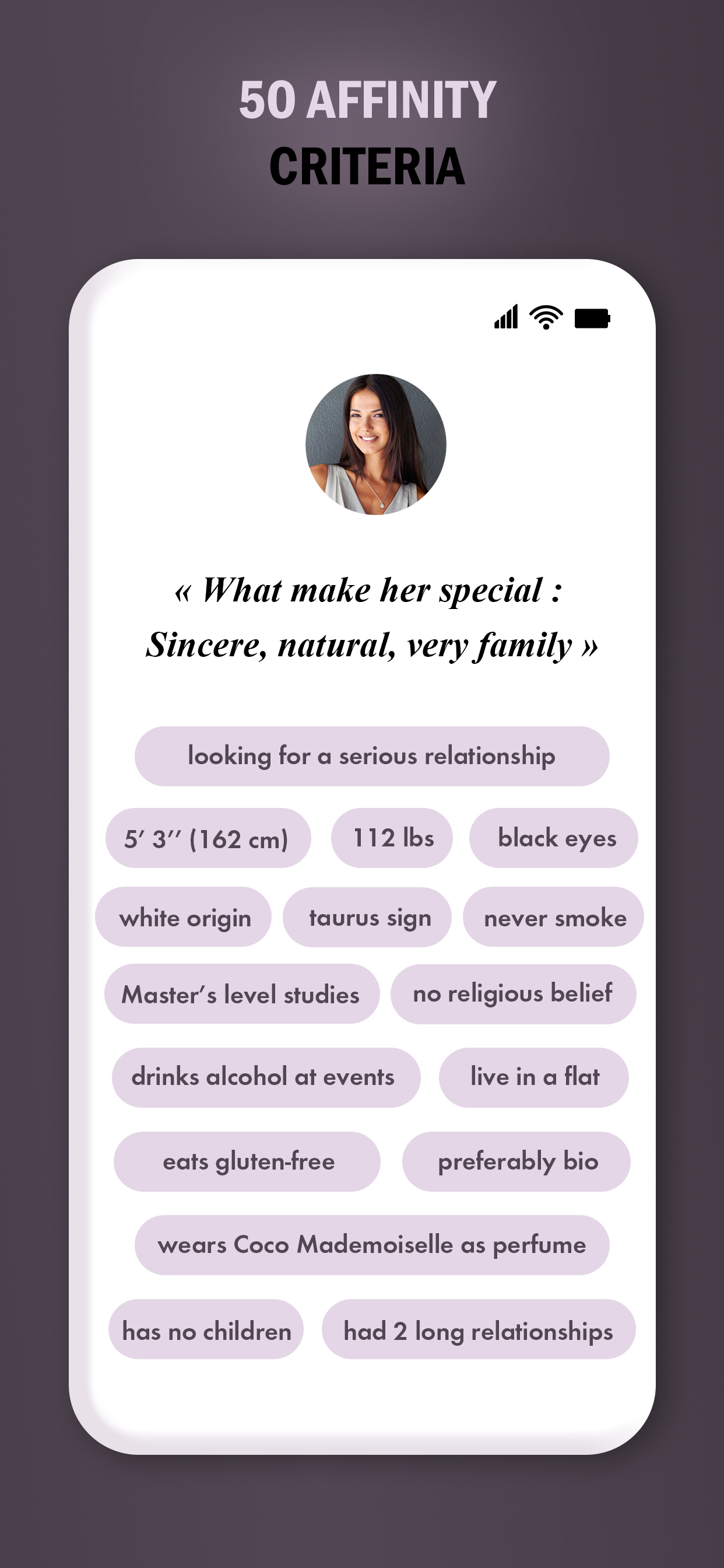 Every day, our Matchmaking AI selects 3 people for you to meet, and you get to choose the one you'd like to connect with (for free).