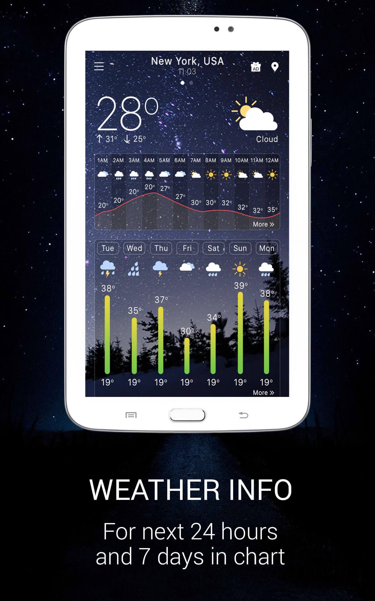 - Weather notification bar: Keeps weather running underground for realtime, you can see the temperature on android system bar without opening app