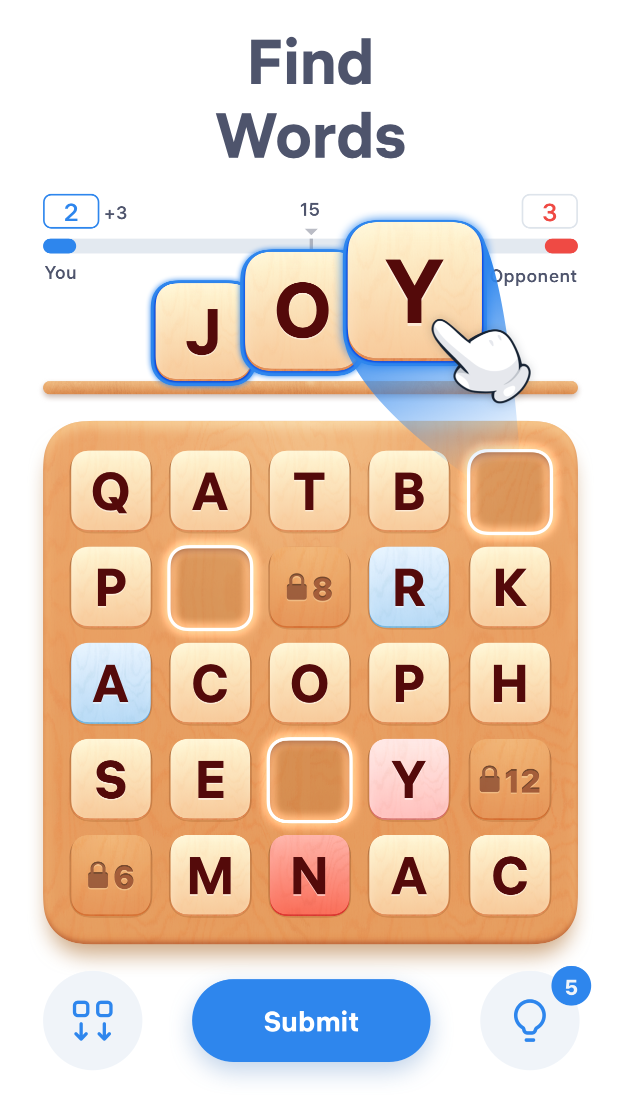 Word Find blends word puzzles with strategy, turning every move into a battle of vocabulary, logical thinking, and strategic planning. Build words, claim letter tiles, and win by earning more points than your opponent. Word Find offers a fresh take on word search games that keeps every match exciting, giving an opportunity to think ahead and outplay your rivals.