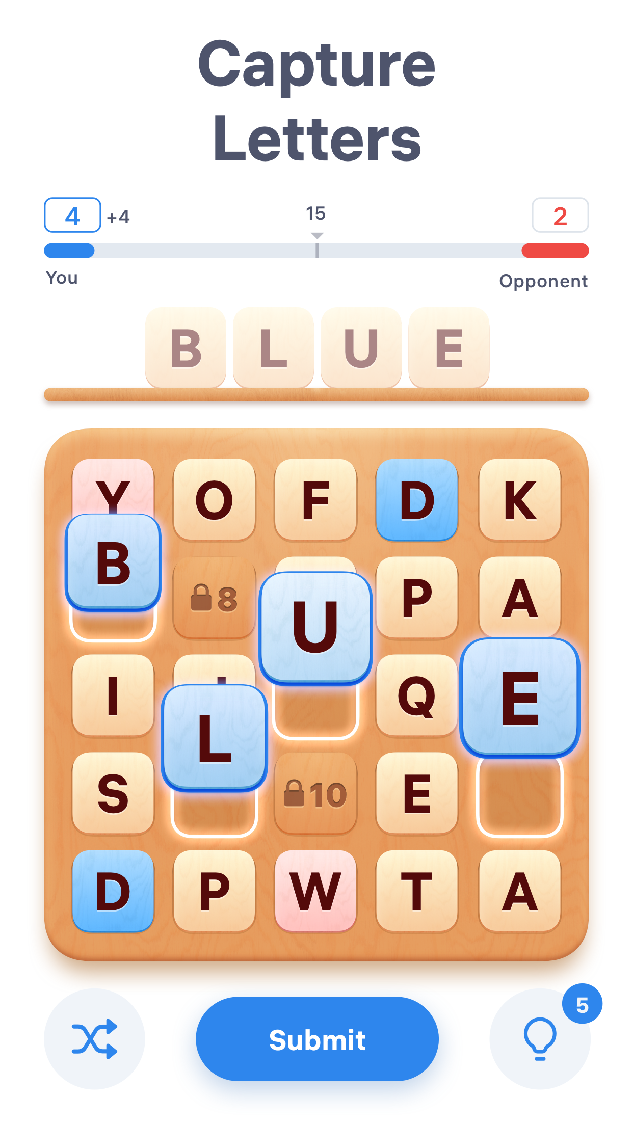 • In order to score more points, capture unclaimed letters or steal them from your word puzzle opponent. Gaining control of key tiles helps shift any word games match in your favor.
