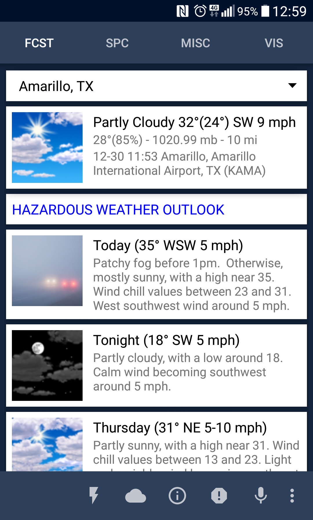 If you *only* need current conditions and your local 7 day forecast then this app is probably more then you need although it will easily provide those 2 things as well. If you are looking for wasted screen real estate or fancy graphics this app is not for you. Given the depth of information covered there is a steep learning curve if you seek to use the program in it's entirety, help information is available and touched on below. Common weather acronyms are used throughout so you should be familiar with those as well. Currently United States locations are supported.