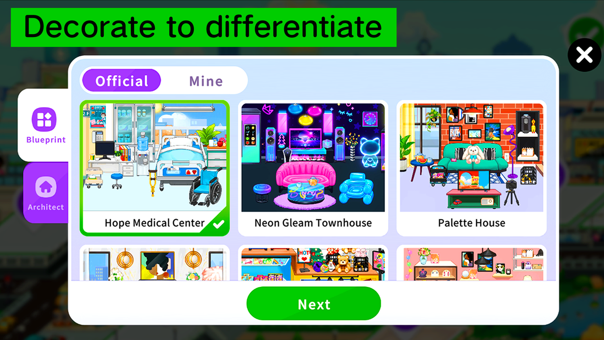 Design your own spaces — from a cozy café or boutique to a luxurious villa or underwater coral castle. The building tools let you decorate and personalize every corner, making each creation truly yours.