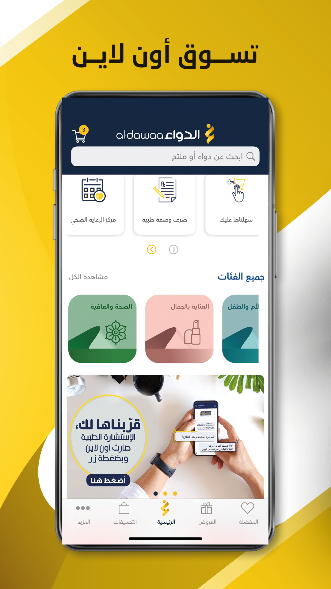 Имея более 900 аптек по всему Королевству, мы заботимся о вас и обеспечиваем все ваши ежедневные потребности через приложение Al Dawaa.