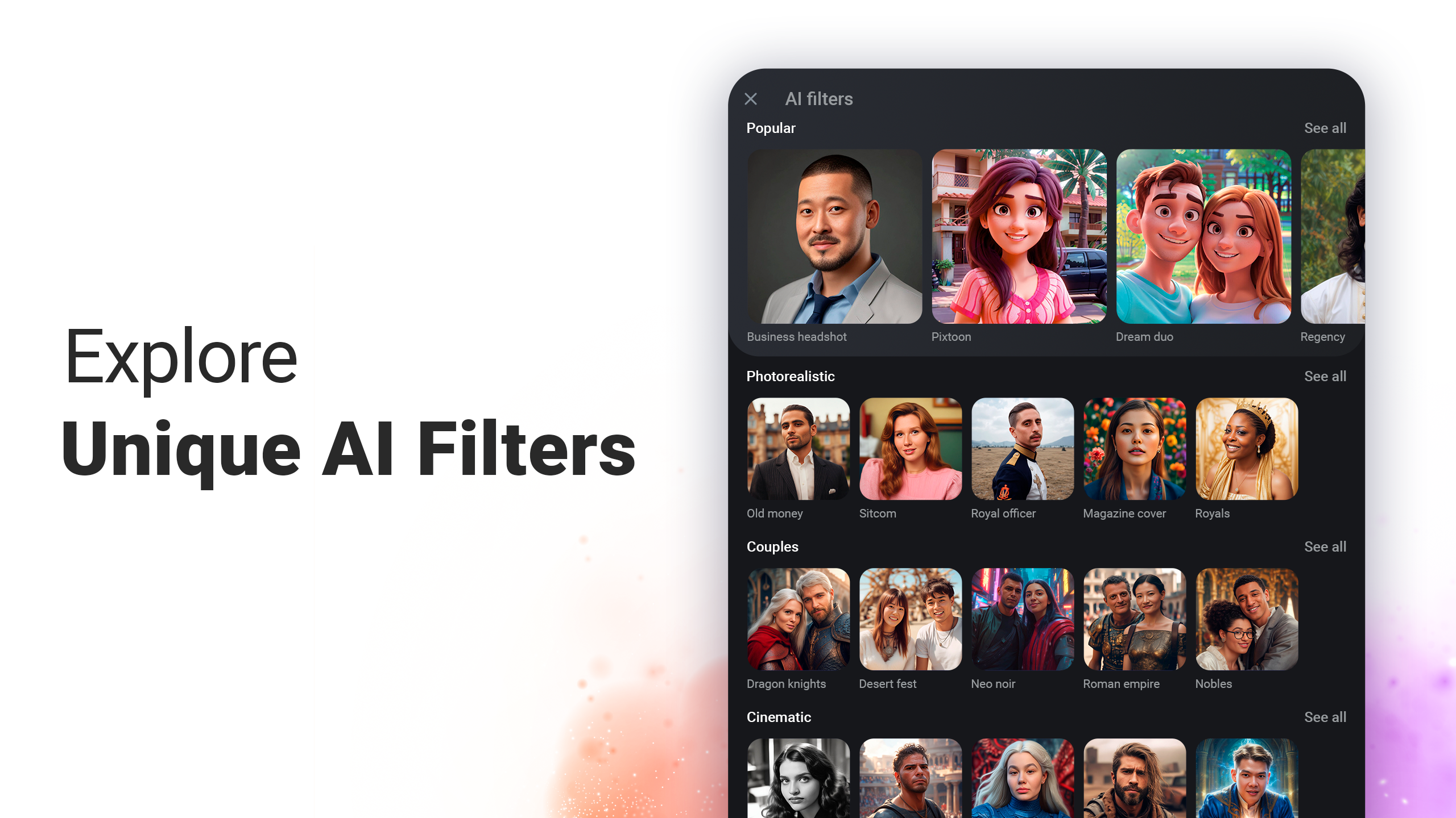Улучшите свою игру в селфи с помощью создателя аватаров с искусственным интеллектом! Загрузите свои фотографии, и мощный фотогенератор с искусственным интеллектом создаст умопомрачительные аватары с искусственным интеллектом. Выбирайте из множества AI-фильтров и станьте главным героем любимого аниме или манги или отправляйтесь в другие вымышленные вселенные.