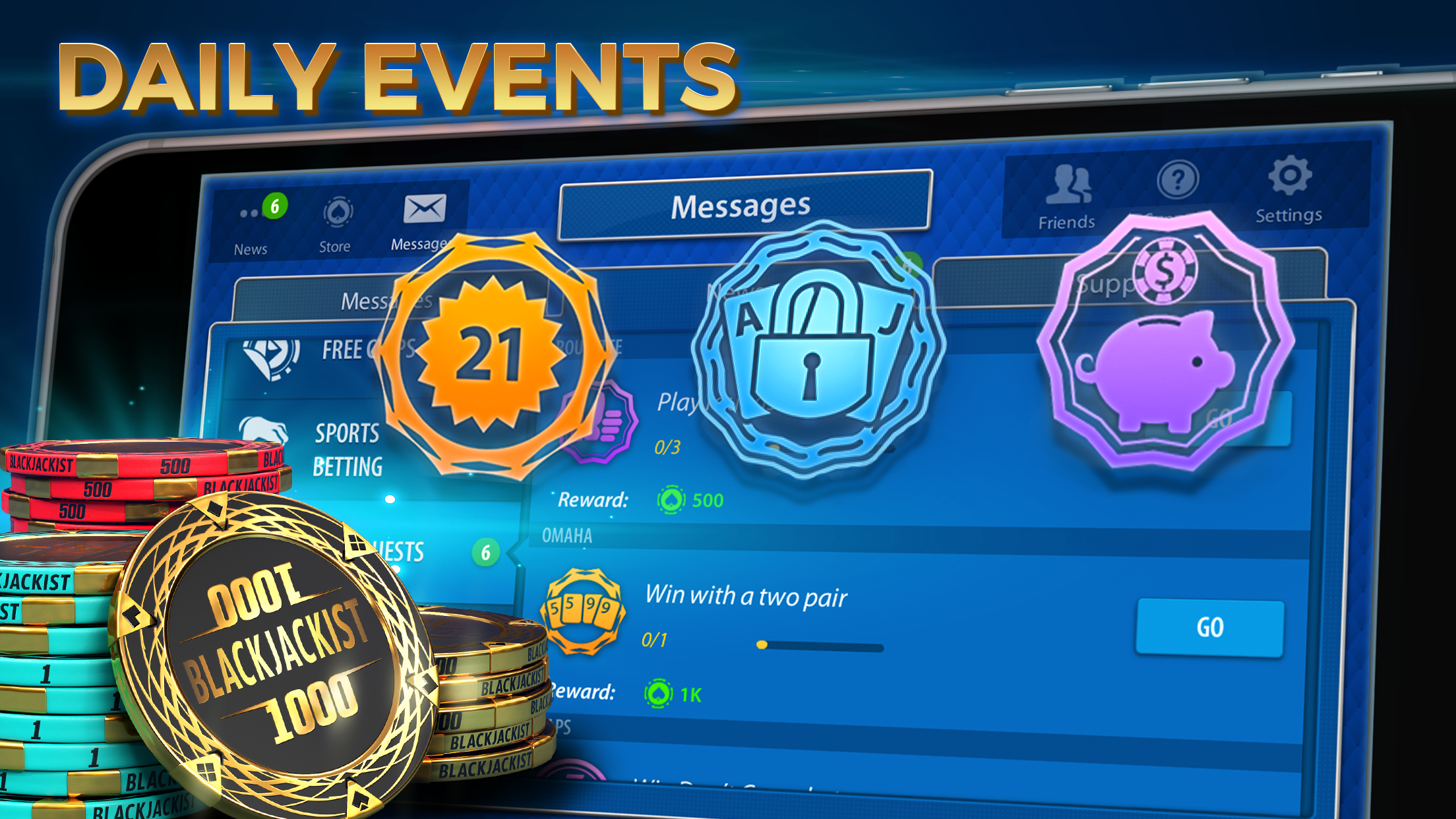 БЕСПЛАТНЫЕ ФИШКИ КАЖДЫЙ ДЕНЬ: Начните свое путешествие в мире блэкджека с нашими щедрыми ежедневными бонусами. Заходите в игру каждый день, чтобы получать бесплатные фишки и особые награды, которые помогут вам дольше оставаться в игре, не прерываясь ни на что. Чем больше играете в блэкджек, тем больше бонусов!