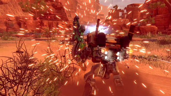You pilot the Desert Raptor MKII, a Mech of extraordinary power. It is a highly-customizable battle vehicle that can be equipped with a variety of offensive systems: heavy, high-powered melee weapons, steam powered hydraulic siege weapons, explosive firearms, and more. It can also be equipped with a variety of defensive systems; high-speed thrusters, boosters for dashing, riot shields, among others.