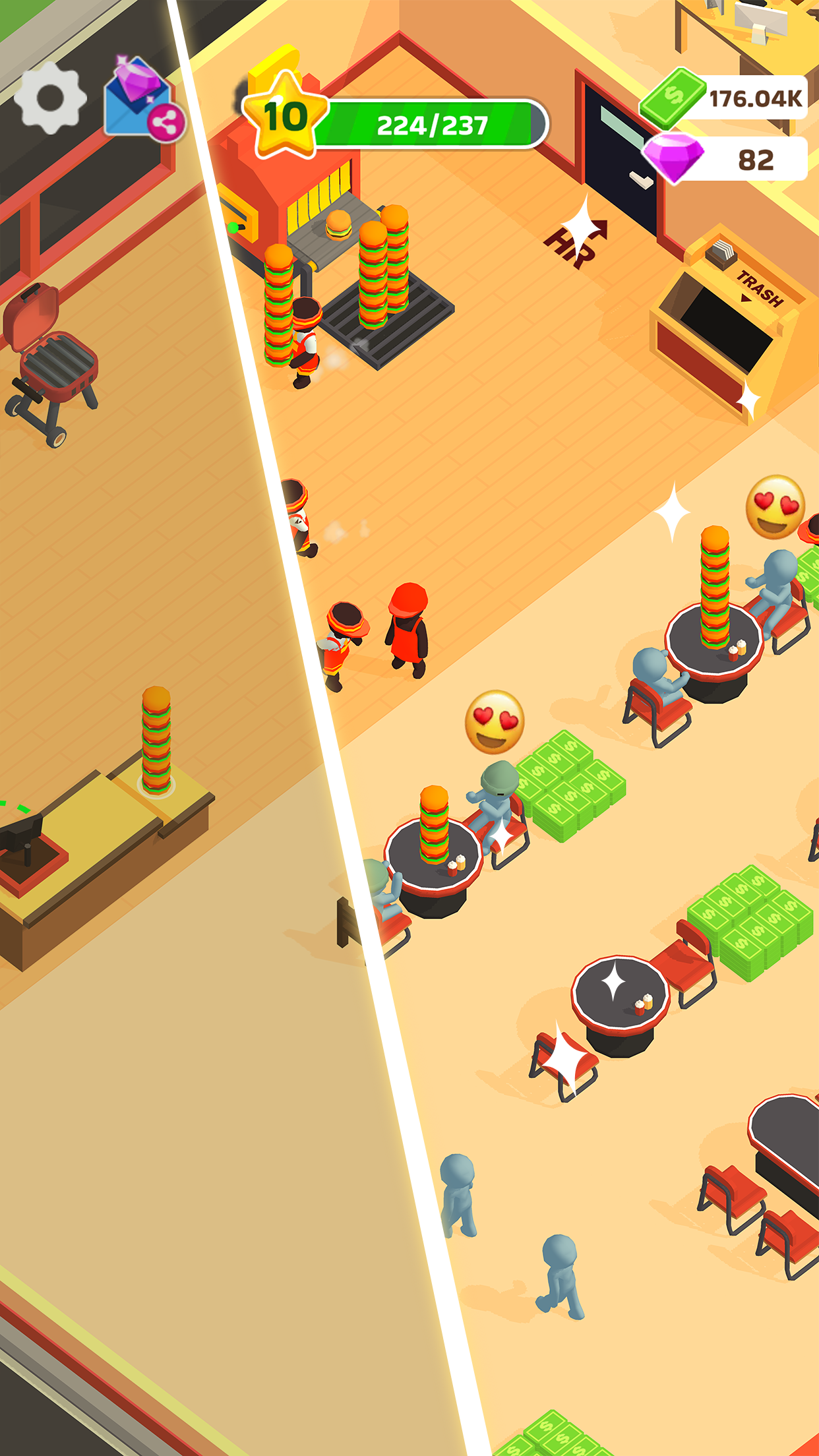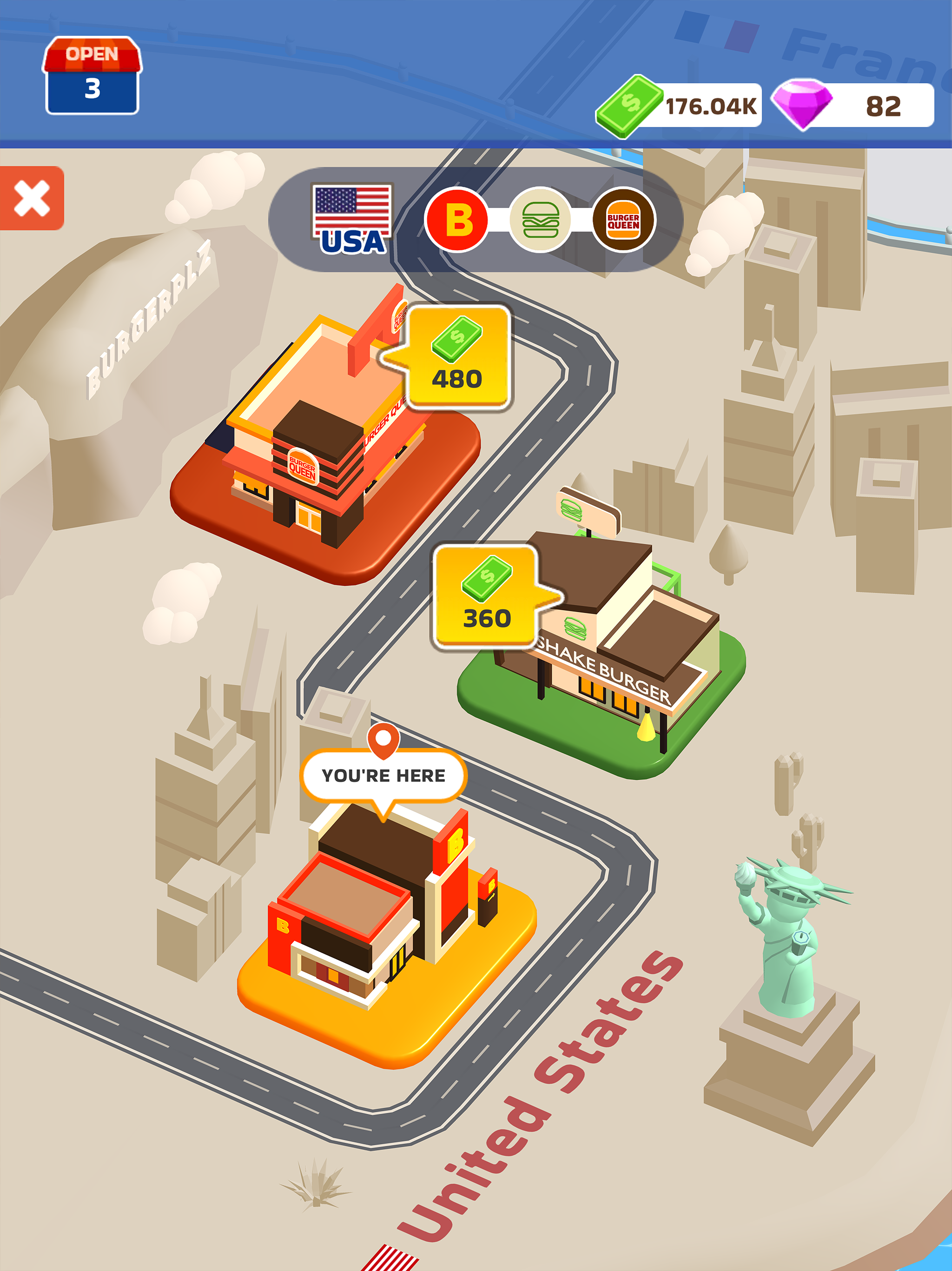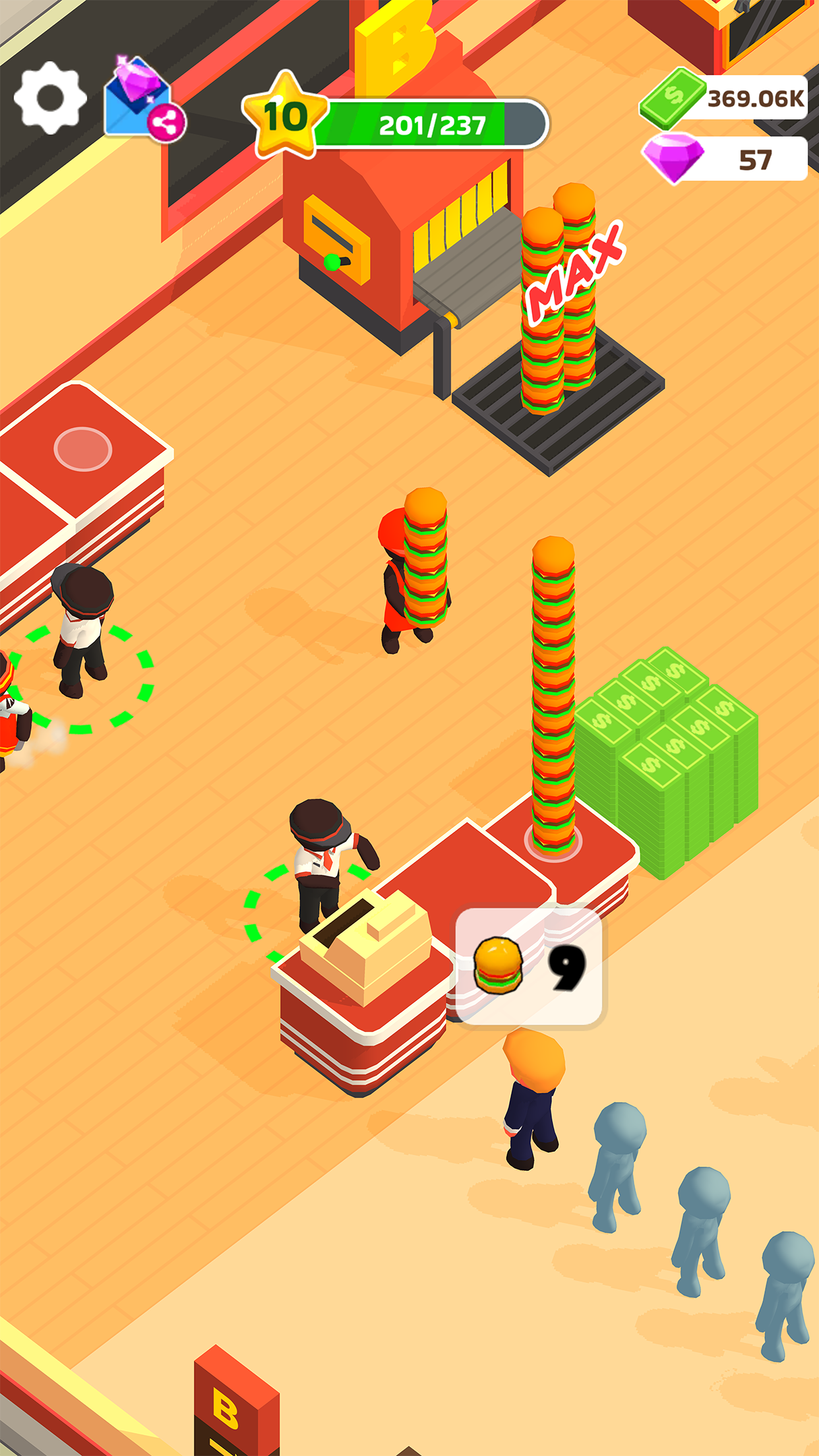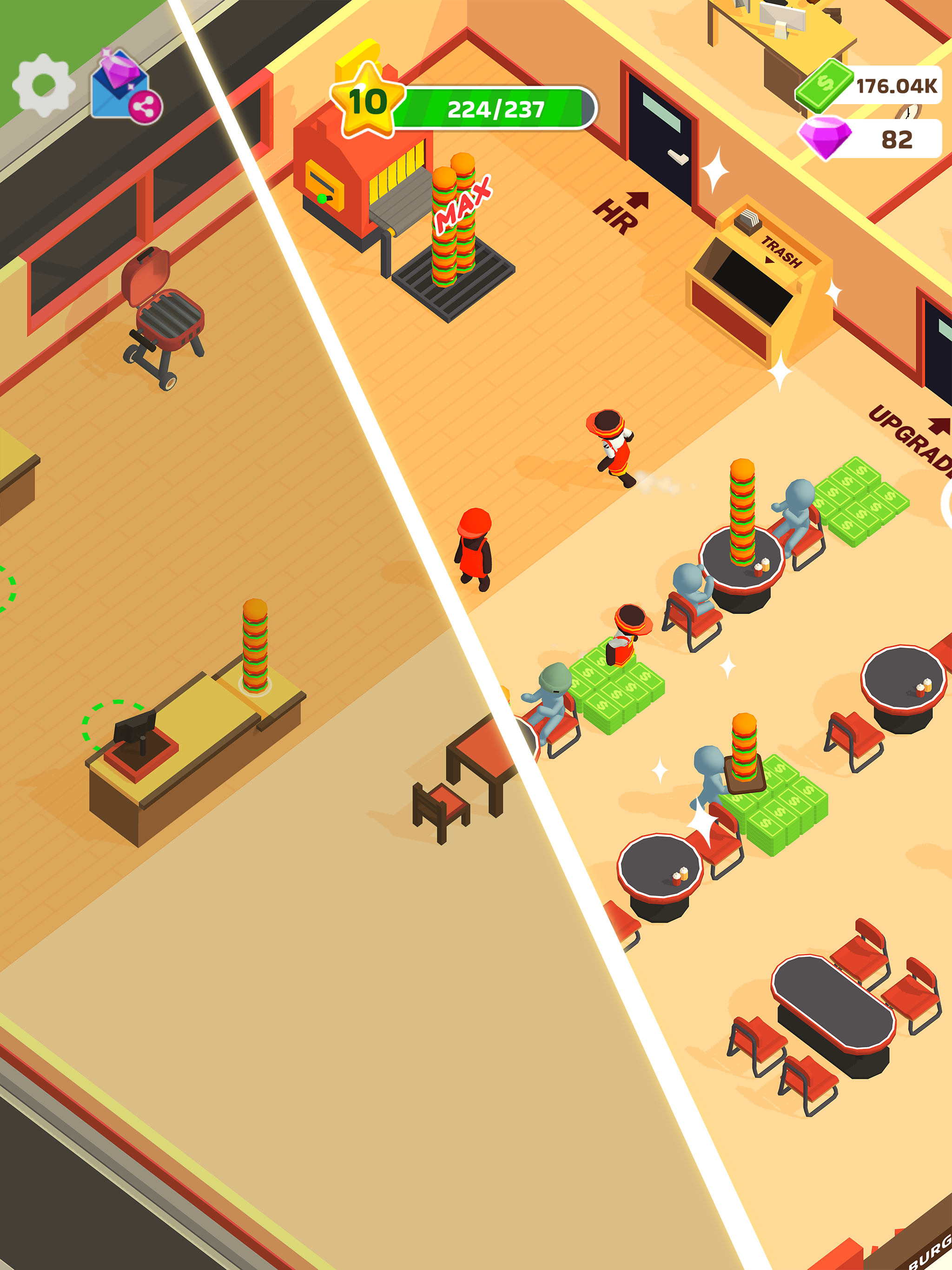 По мере прохождения игры вы сможете улучшать свои способности и возможности, а также повышать эффективность управления магазином. Вы также сможете создавать сети магазинов бургеров, распространяя повсюду свой бренд. Чтобы это произошло, вам придется много работать, чтобы ваши клиенты были довольны, а ваше бургер-кафе работало без сбоев.
