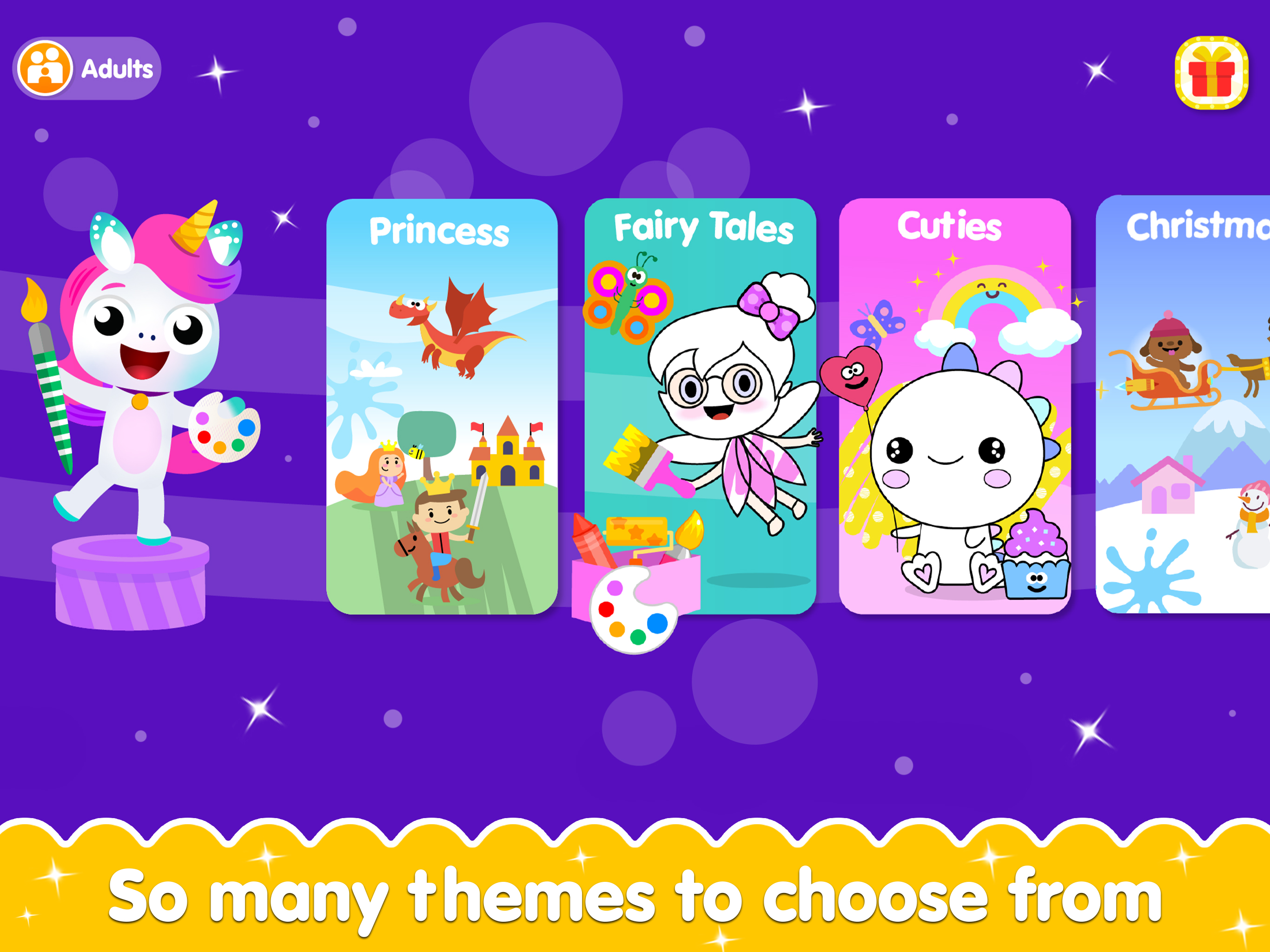📚 Сказки: Погрузитесь в классические сказки, когда вы приносите в свои цвета культовые истории, такие как бабочка, единорог, замок Спящей красавицы и маленькие волшебные палочку приключений.