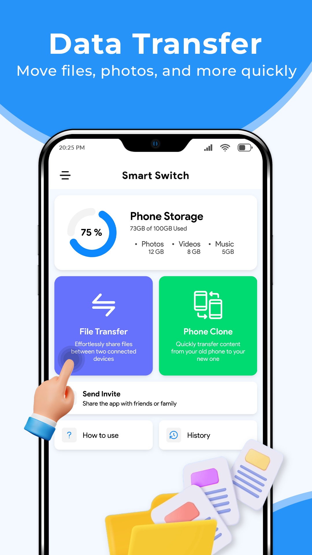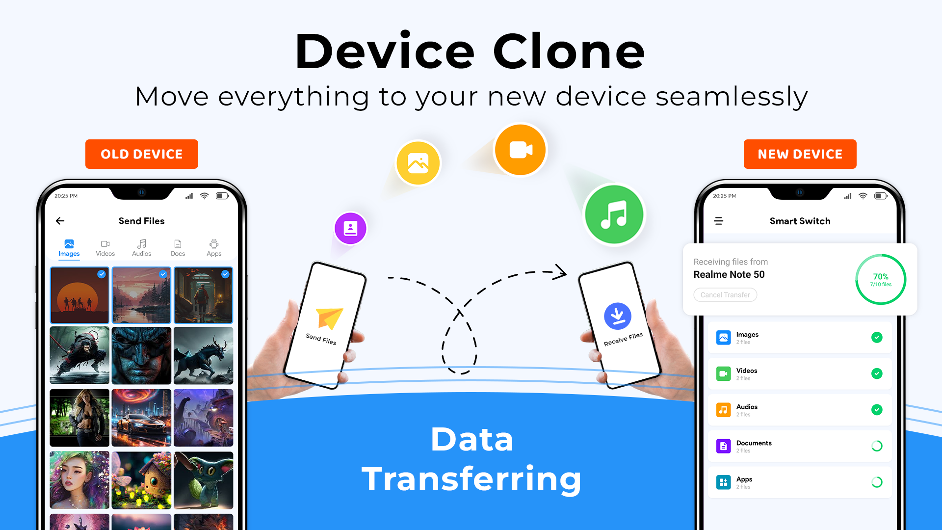 Наше приложение идеально подходит для тех, кто хочет клонировать телефоны или выполнить резервное копирование данных. Независимо от того, переходите ли вы на новое устройство или делитесь файлами с другом, Copy My Data предлагает надежное и простое решение. Попрощайтесь со сложными настройками и медленной передачей — наше приложение позволяет легко переключать контент между устройствами.