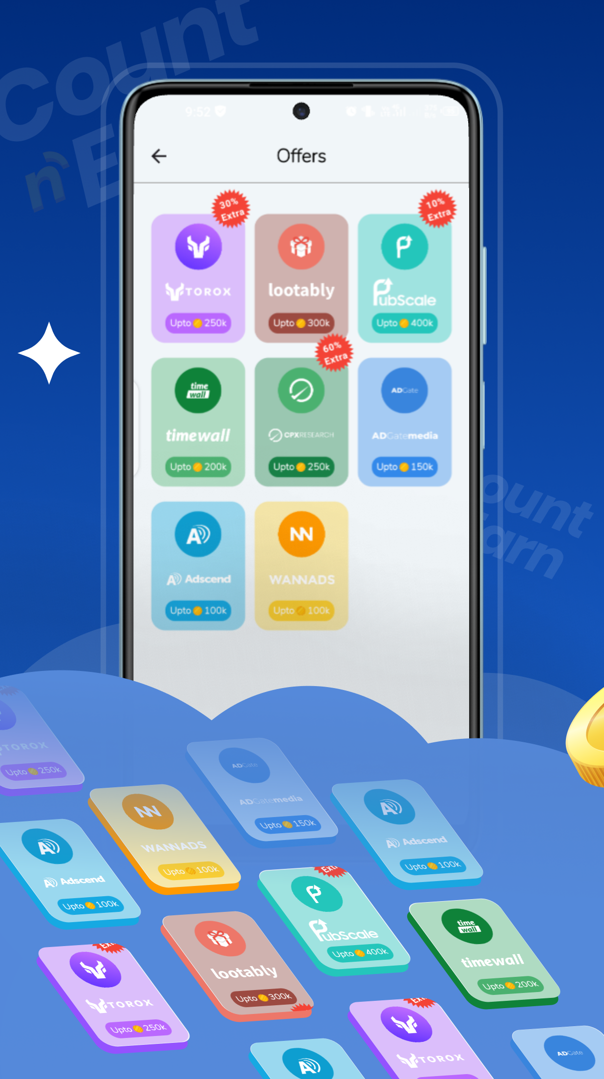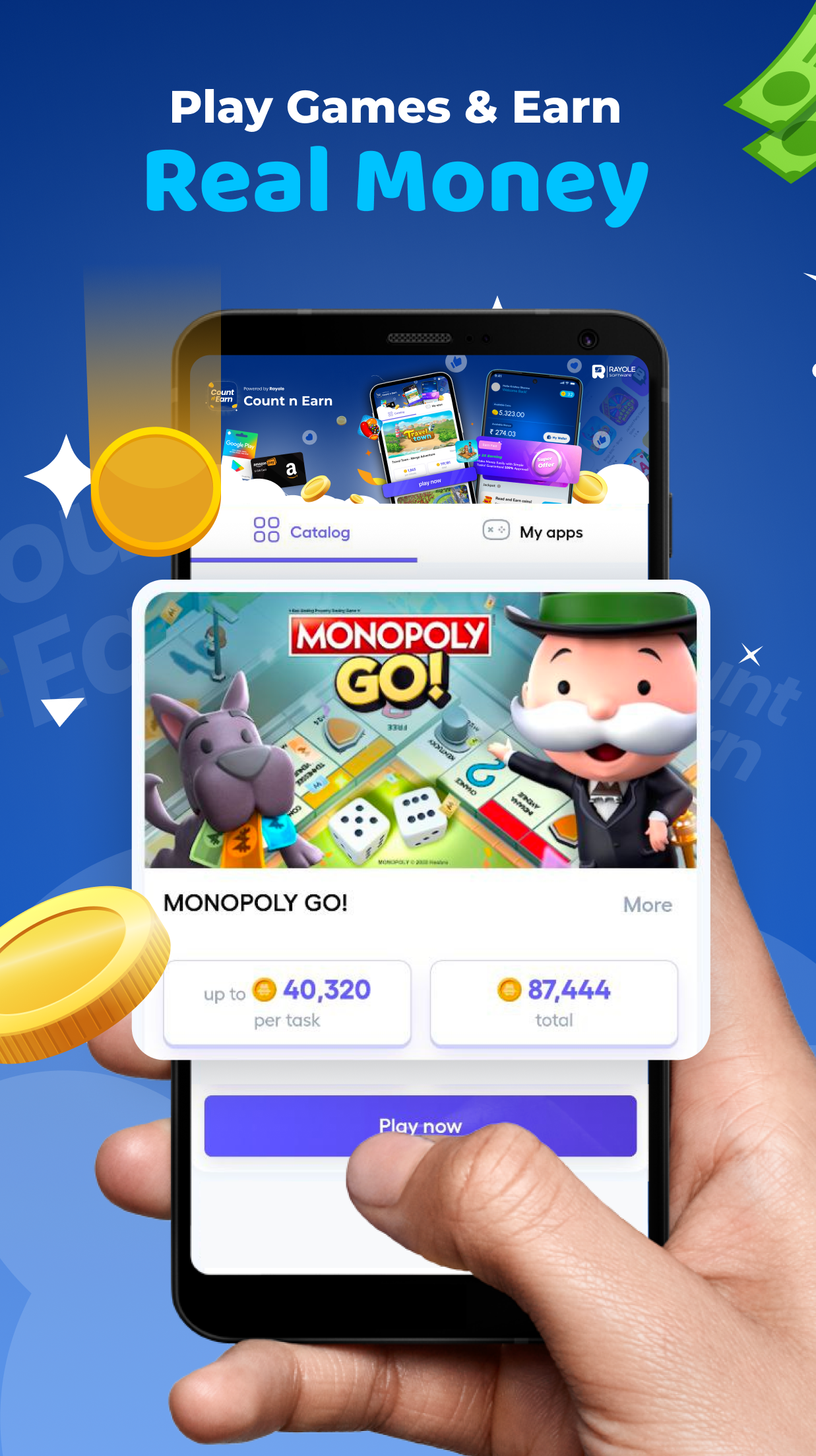 Выполняйте действия, чтобы собирать баллы, которые можно конвертировать в реальные денежные вознаграждения.