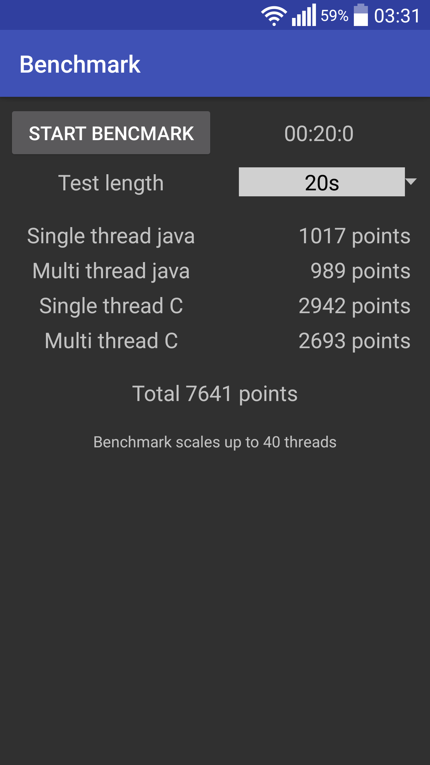 Применение имеет встроенный бенчмарк, который проверяет Java и родные C одно- и многопоточная производительность.