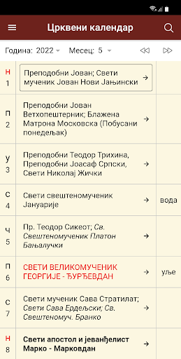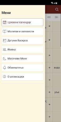 Православный церковный (религиозный) календарь с житиями святых. В последующие годы они регулярно добавляются в приложение. Помимо церковного календаря, приложение содержит молитвы и заповеди, даты Пасхи, пасхальные месяцы, а также сербские православные имена. При необходимости пользователь может вводить свои молитвы в приложение.